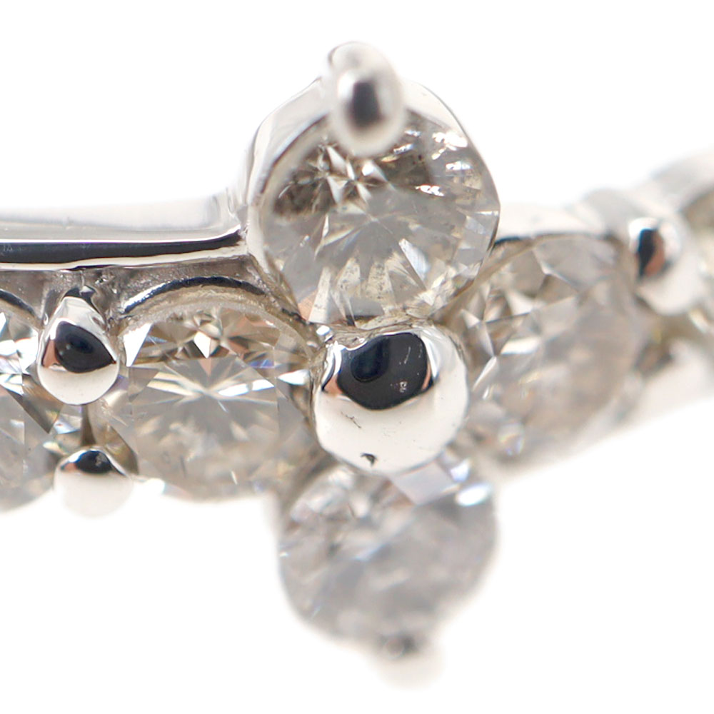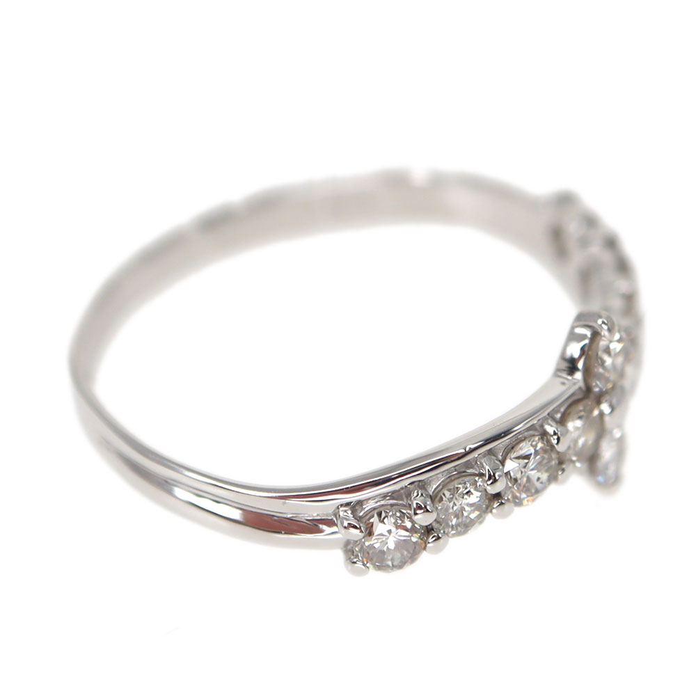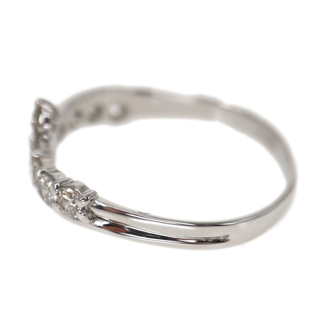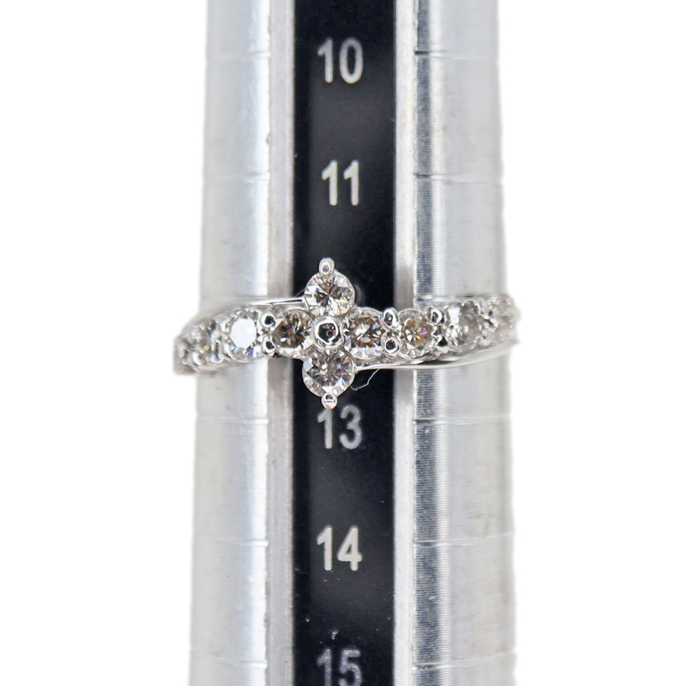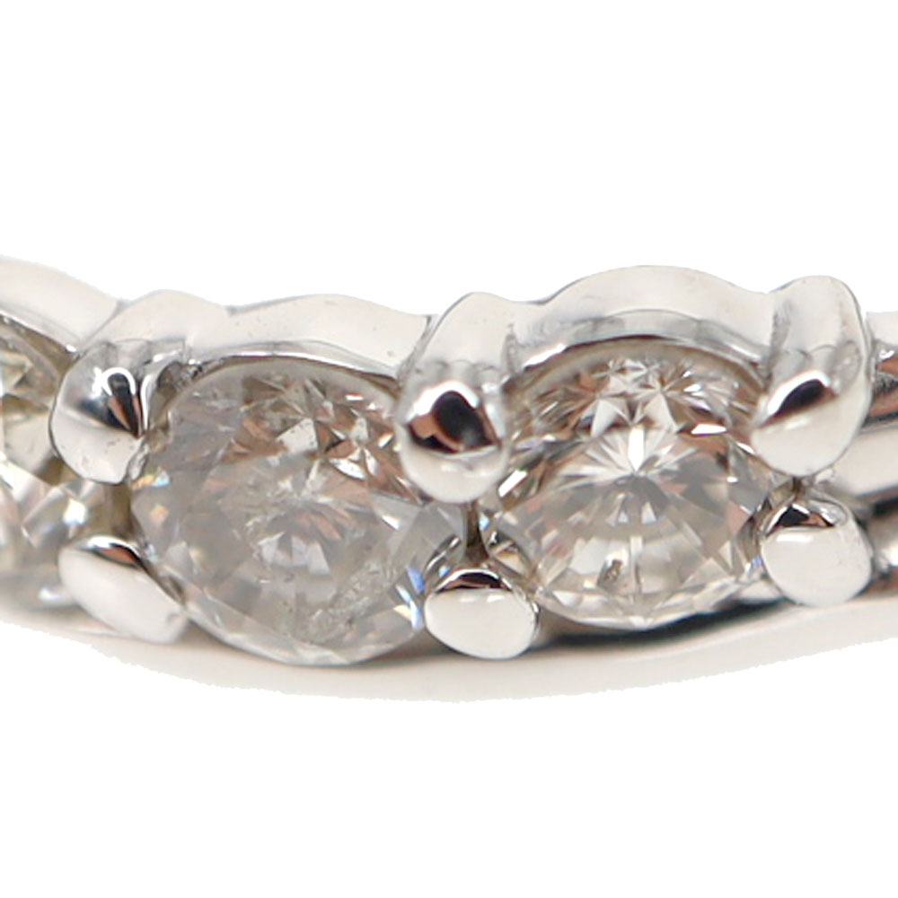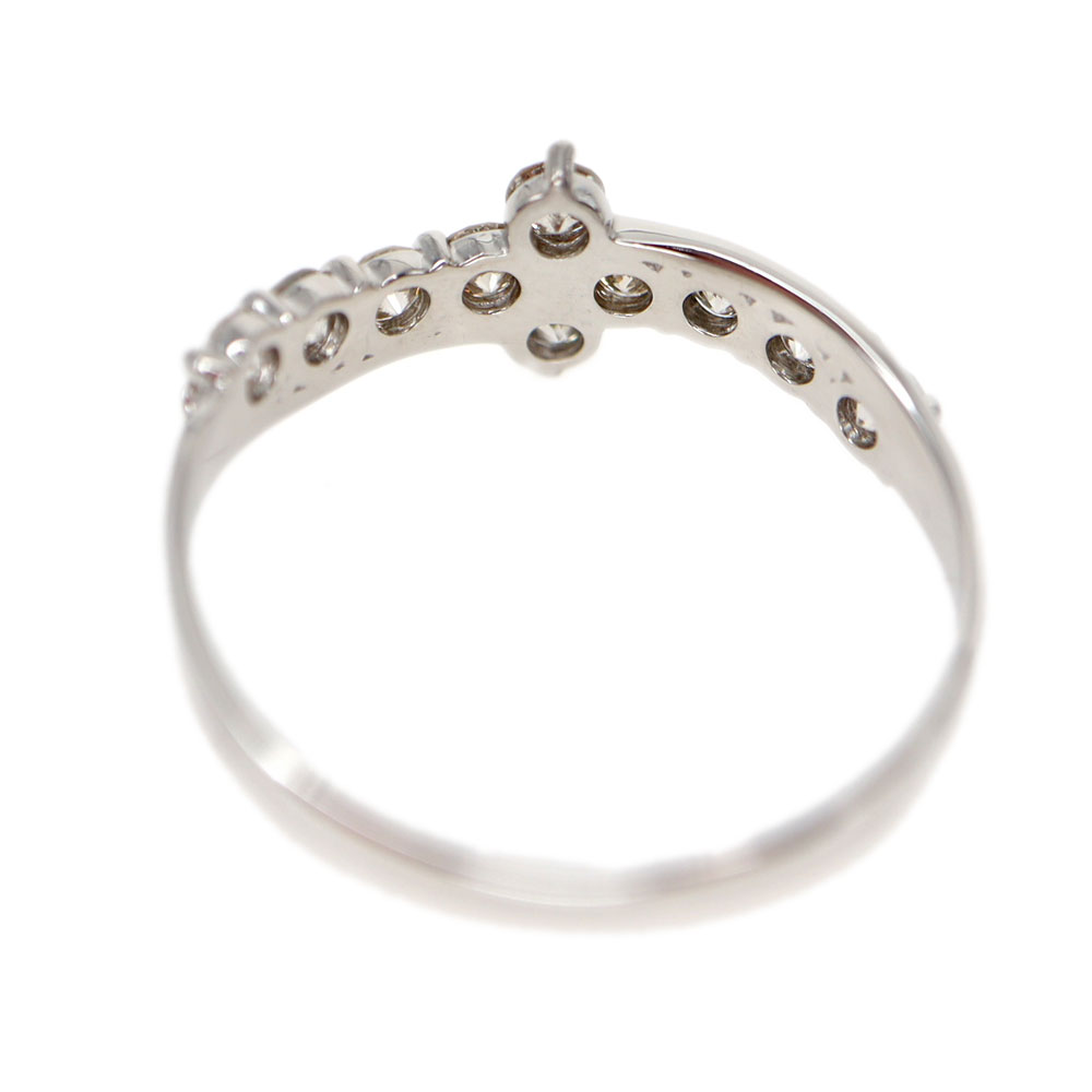 十字架や花のようにも見えるダイヤモンドのモチーフが特徴的なリングです。 リング自体がやや曲線を帯びているので、指が美しく見えます。 プラチナの輝きに加え、一列に施されたダイヤモンドがキラキラと輝きます。
