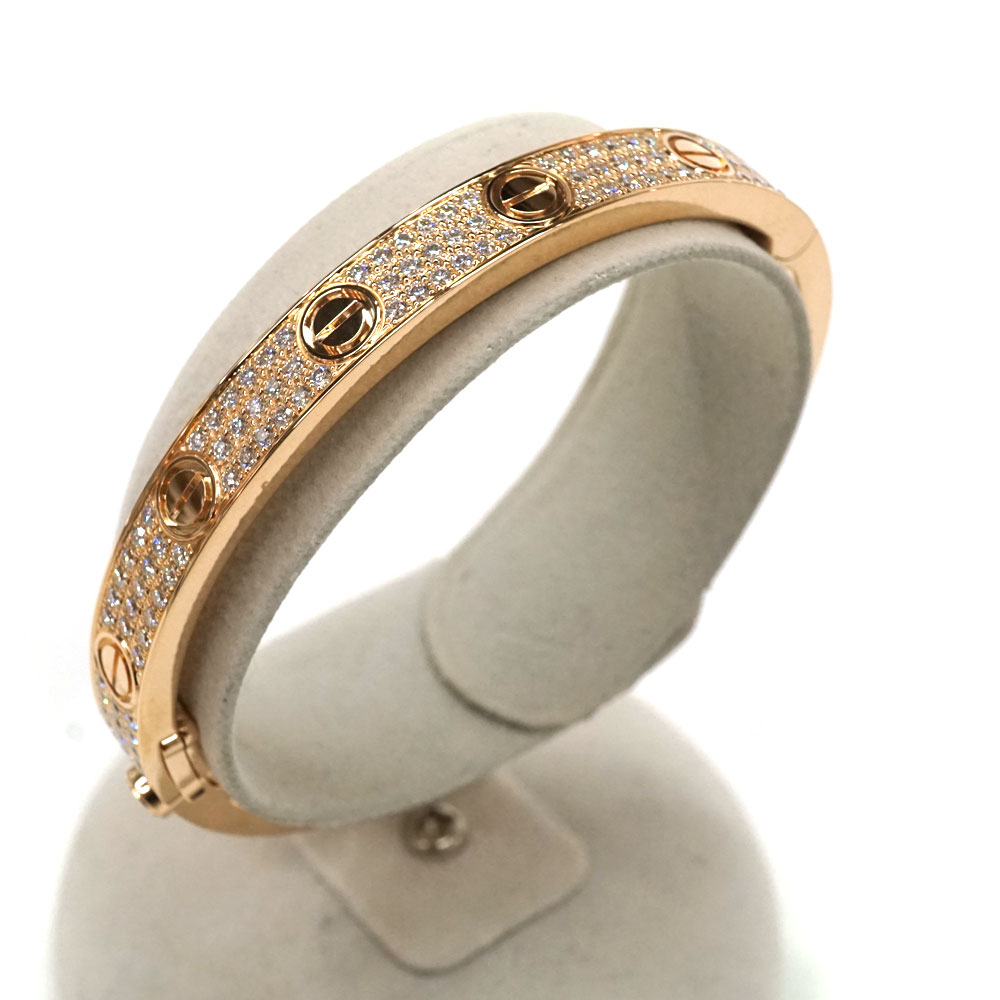 カルティエの定番人気ラブコレクションのお品物です。 ビスモチーフ特徴的なデザインで、こちらはダイヤモンドが豪華にあしらわれたデザインです。 流行り廃りなく長くお使い頂けるタイムレスなブレスレットです。 お探しの方はこの機会に是非いかがでしょうか。