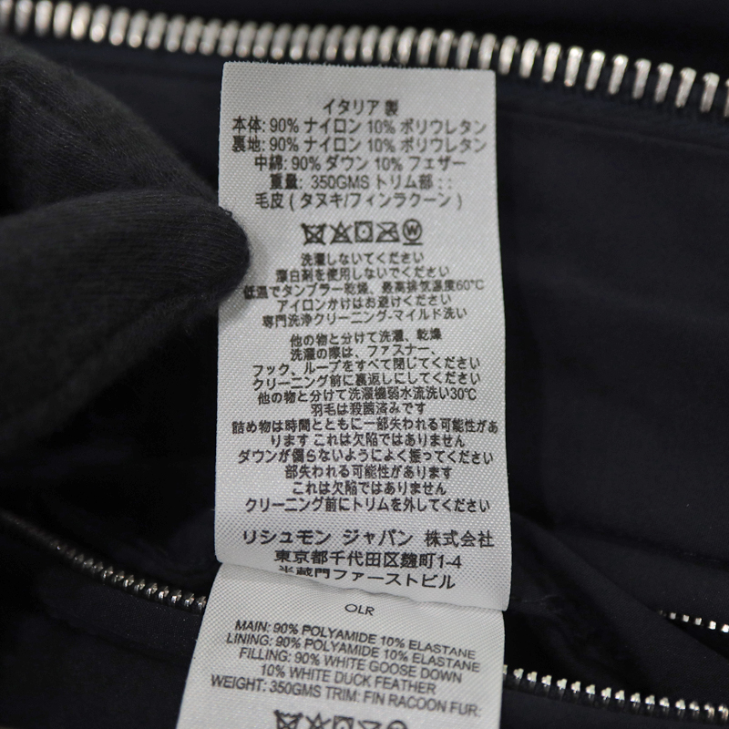 | 素材/カラー | 表地:ナイロン90%、ポリウレタン10%、裏地:ナイロン90%、ポリウレタン10%、中綿:ダウン90%、フェザー10%、トリム部:毛皮(タヌキ、フィンラクーン)/ブラック系 |