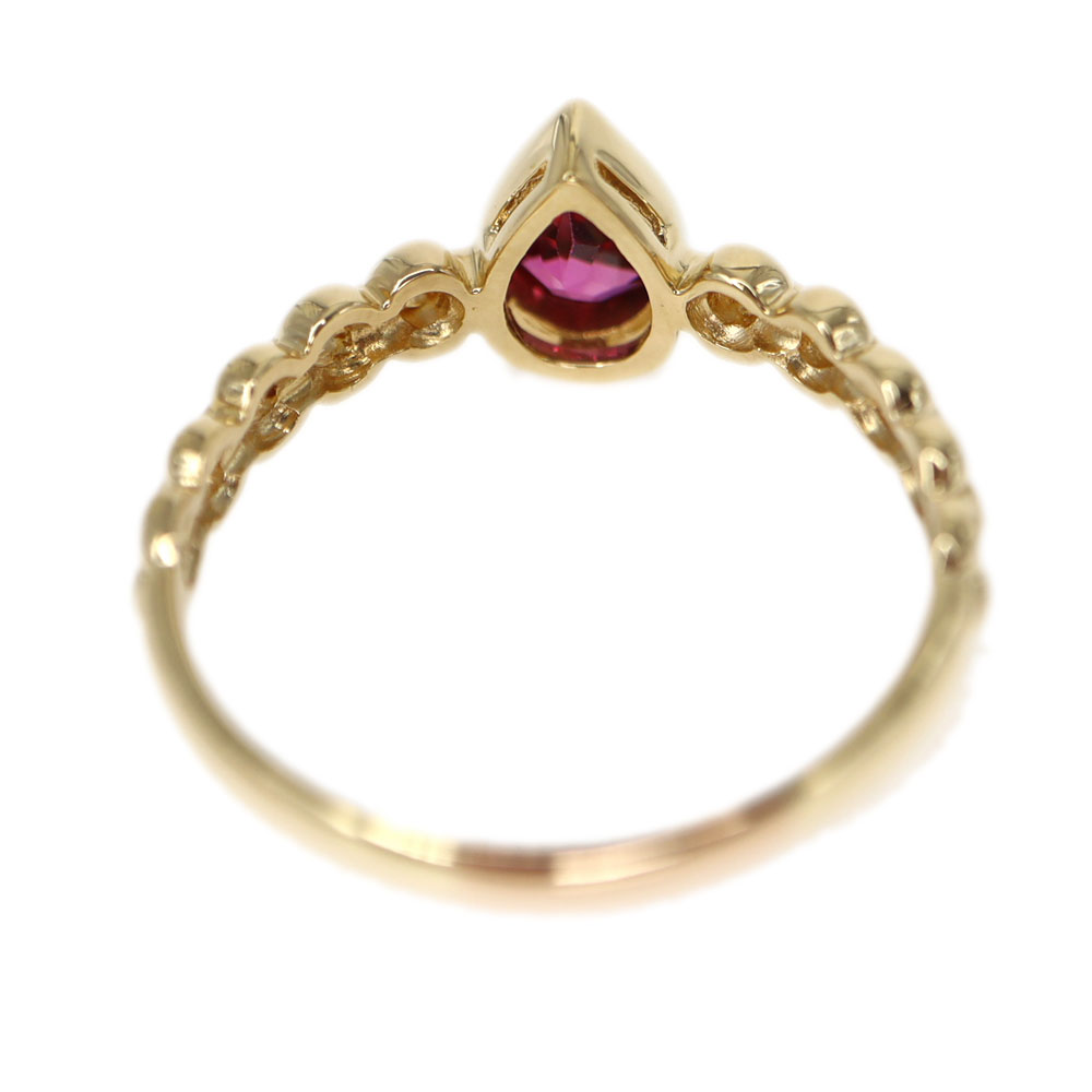 中央にガーネットがセッティングされた指輪です。 ドロップのようなモチーフがシンプルながらも美しいデザインです。 重ね付けしても映えるリングとなっています。