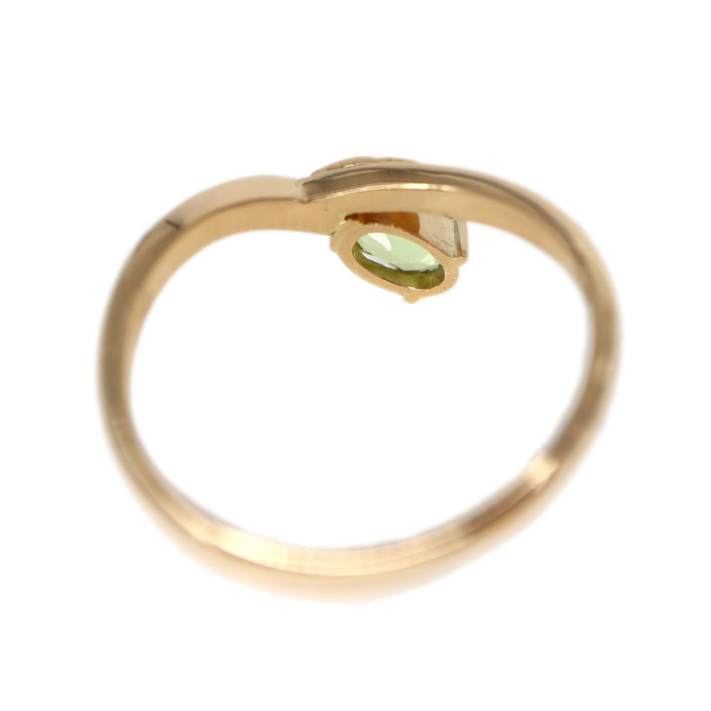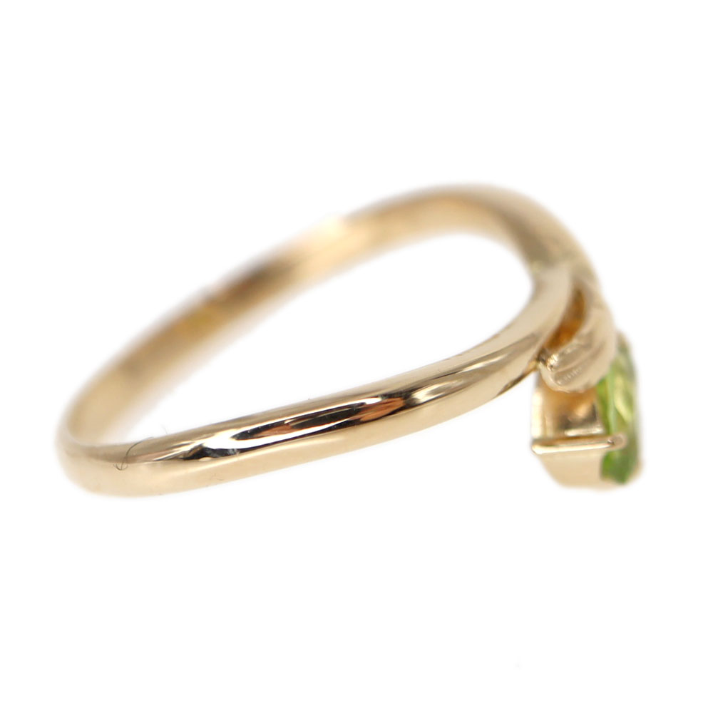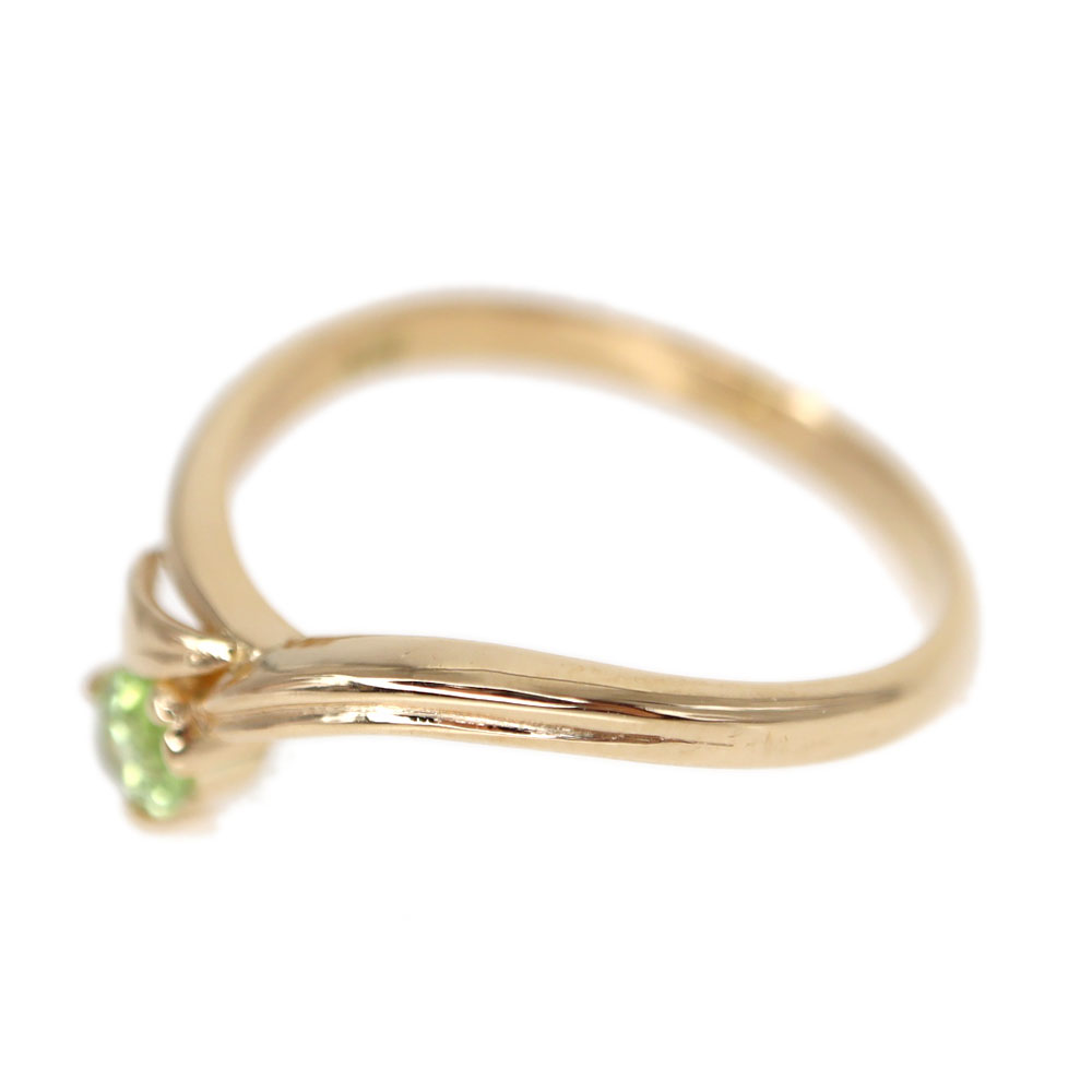 淡いグリーンのペリドットがセットされた華やかなリングです。 一点でもお手元が華やぐアイテムです。 柔らかな曲線のリングが上品で指先を美しく魅せてくれます。