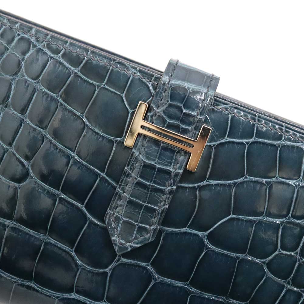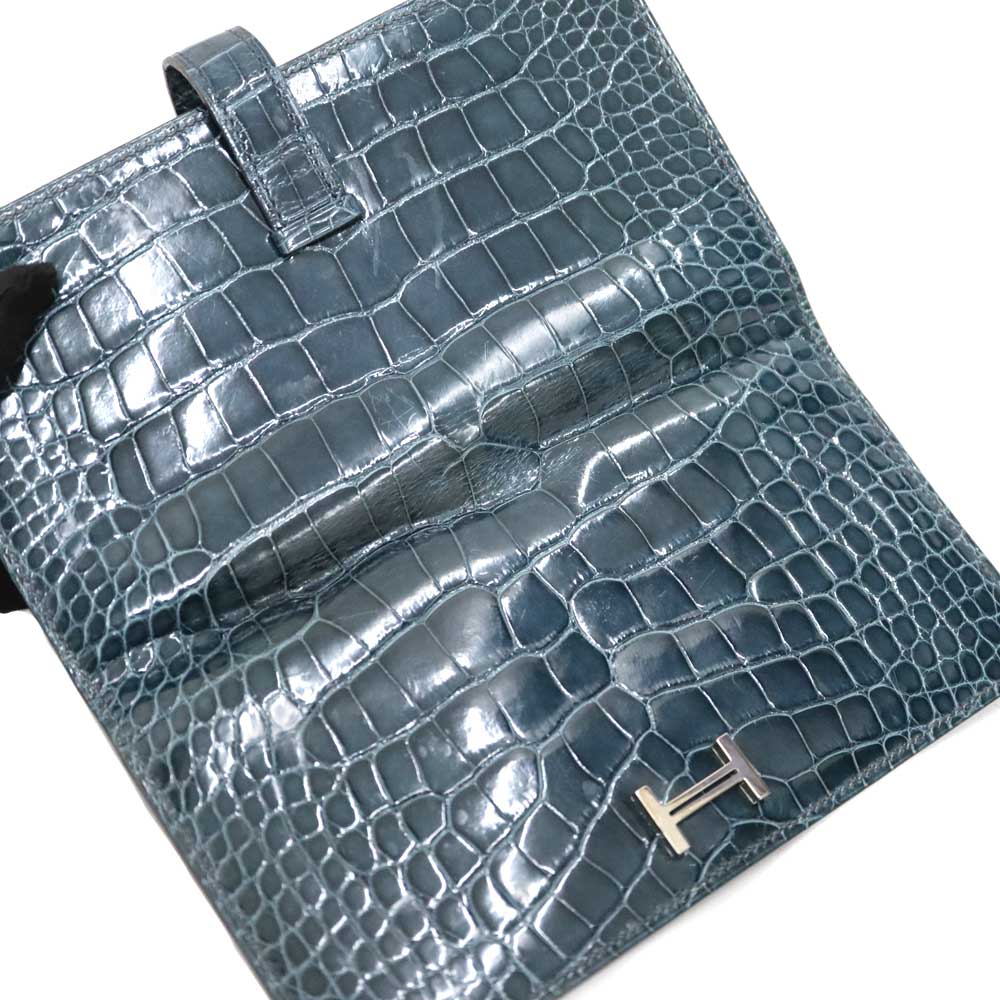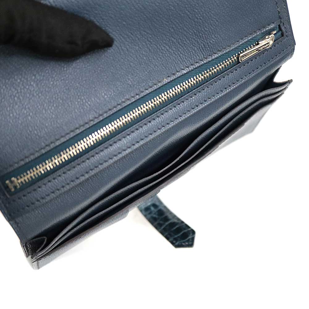 光沢感のあるアリゲーターレザーを使用した、上品でクラシックな長財布です。 落ち着いたティールカラーとH金具が洗練された印象を与えてくれます。 こちらはマチのあるタイプなので収納力も十分です。 この機会にぜひいかがでしょうか。