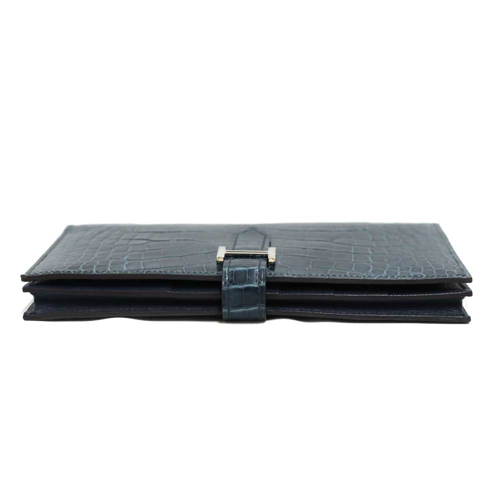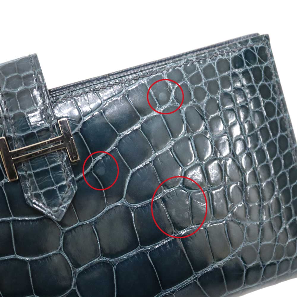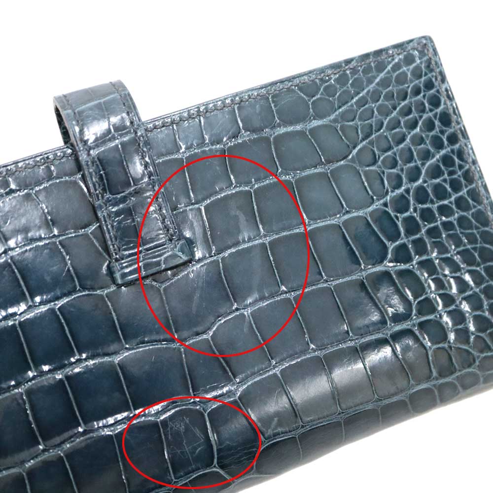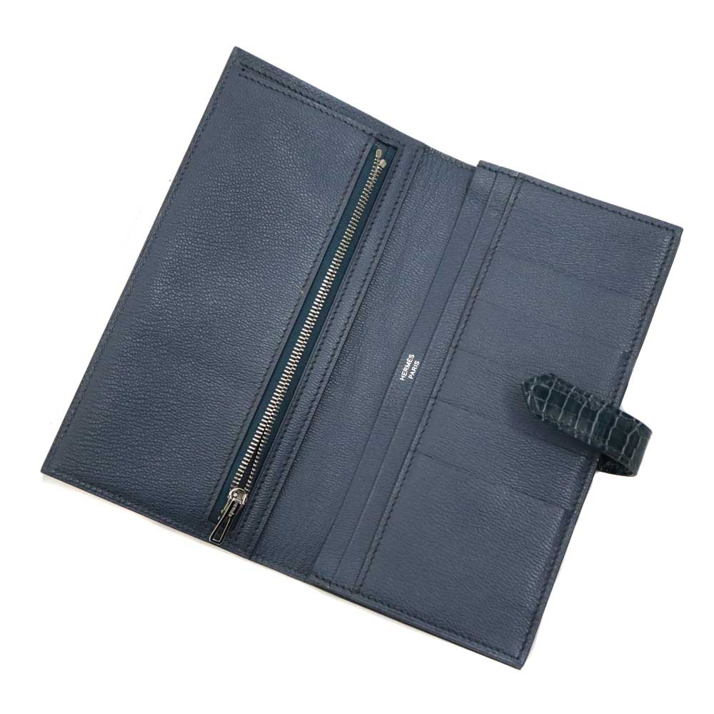 光沢感のあるアリゲーターレザーを使用した、上品でクラシックな長財布です。 落ち着いたティールカラーとH金具が洗練された印象を与えてくれます。 こちらはマチのあるタイプなので収納力も十分です。 この機会にぜひいかがでしょうか。