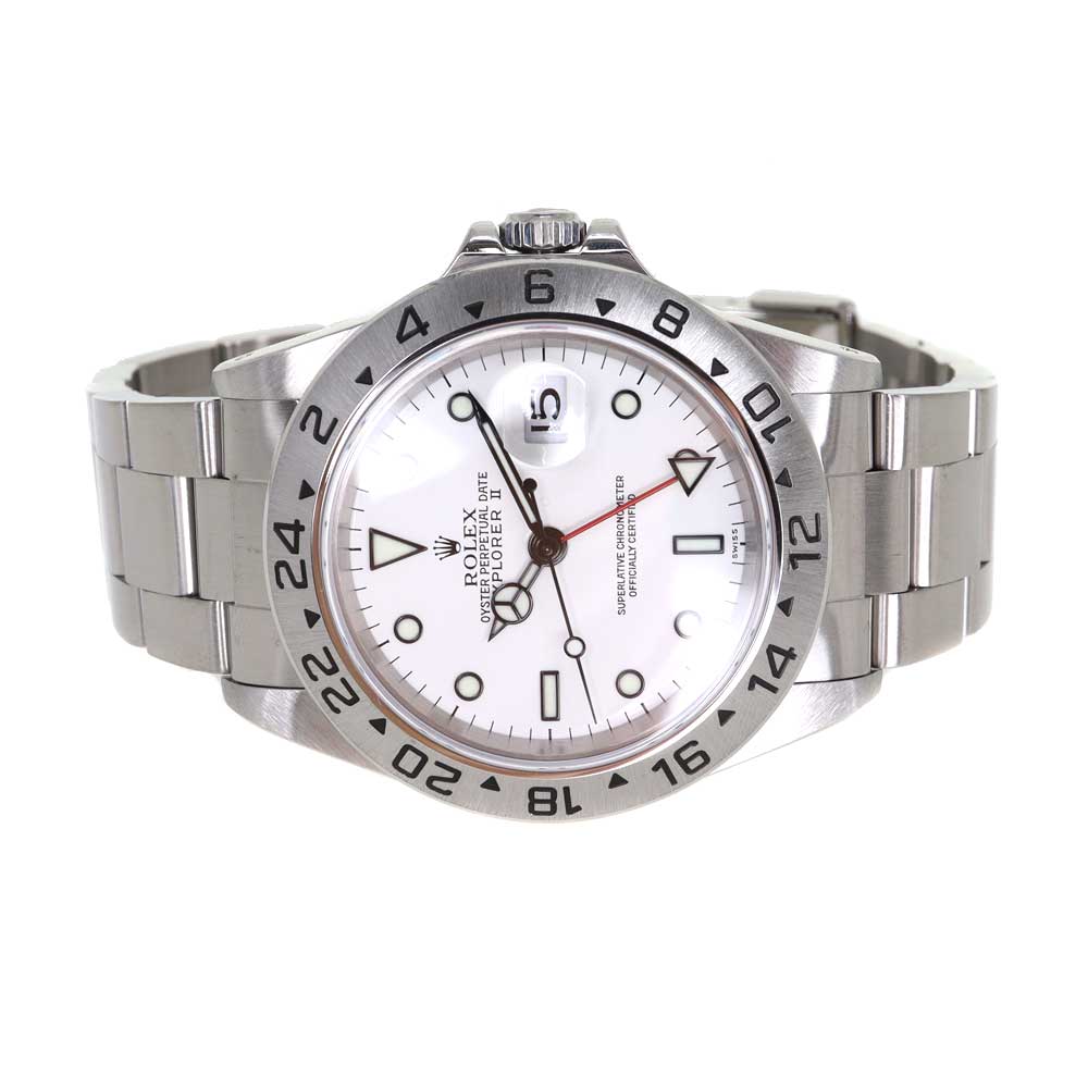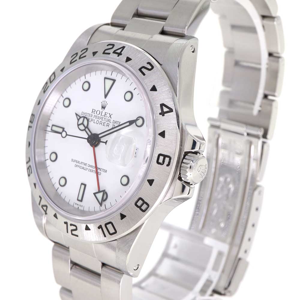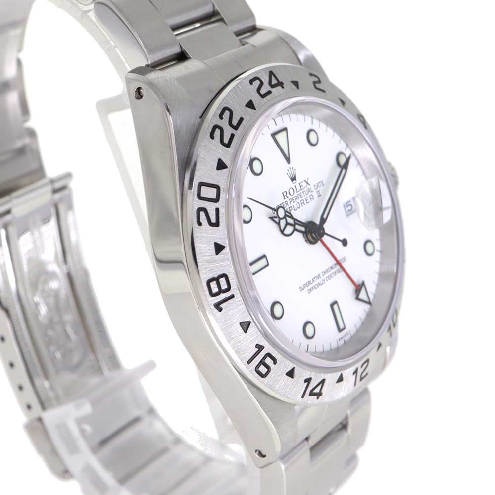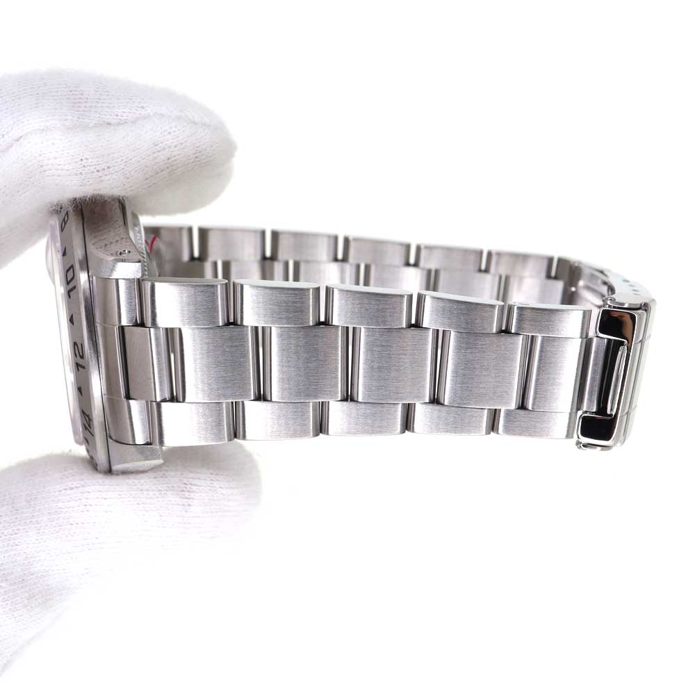 洞窟探検家向けに耐久性、機能性を強化したエクスプローラー2の第三世代のモデルです。 デイト表示、GMT機能、100防水、48時間パワーリザーブなど機能面が優れています。 ベゼル上の文字が少し細くスマートになった印象、ホワイト文字盤が映えるお時計です。 お探しの方はこの機会にぜひいかがでしょうか。