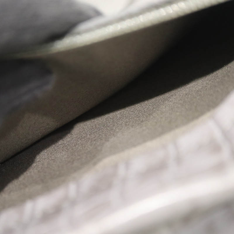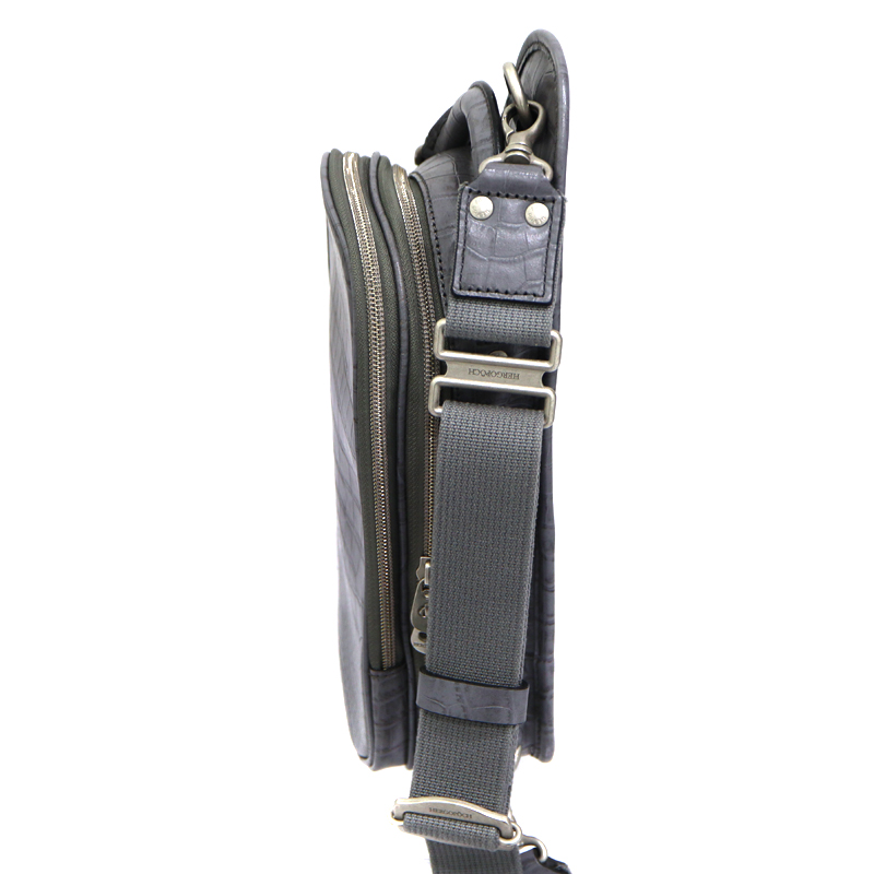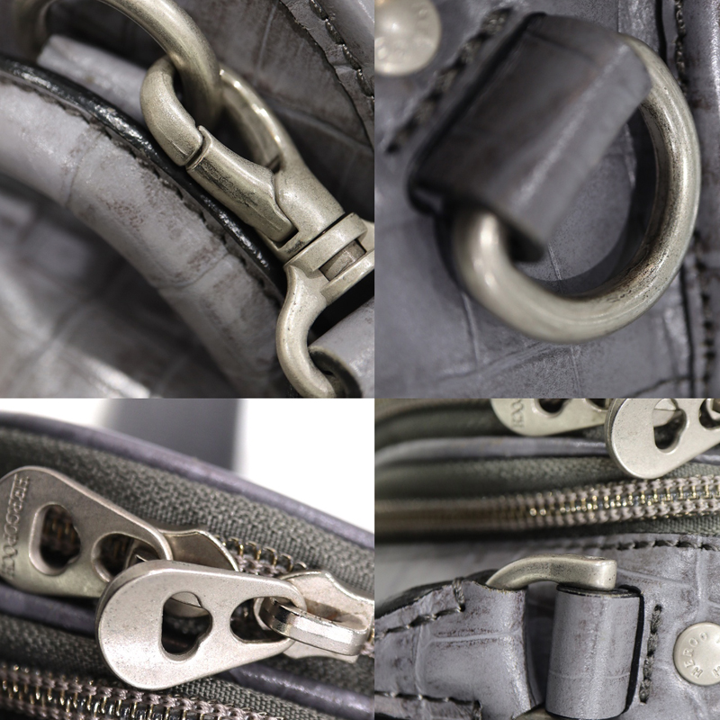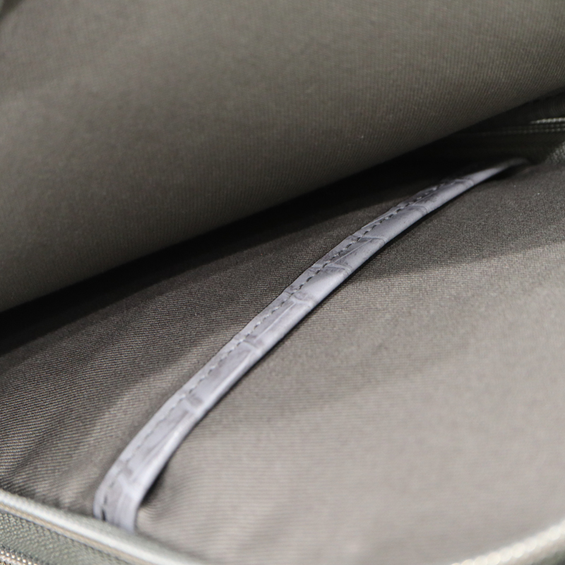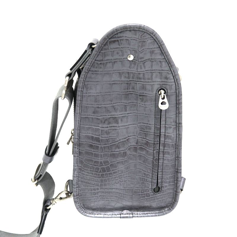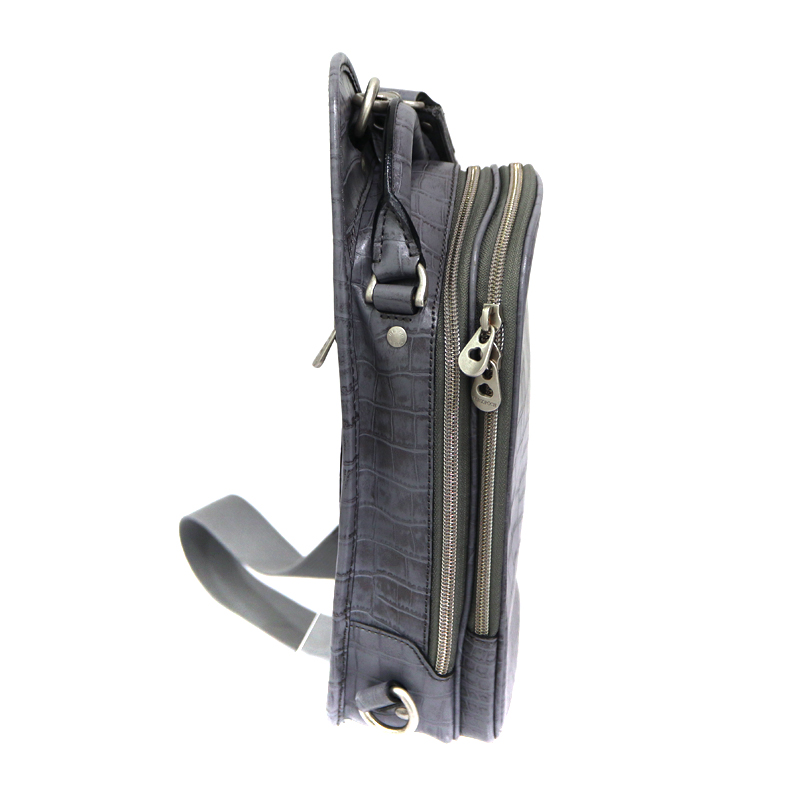 味わい深いグレーのワキシングレザーをベースに、クロコダイル型押しをアクセントとして組み合わせたデザイン。