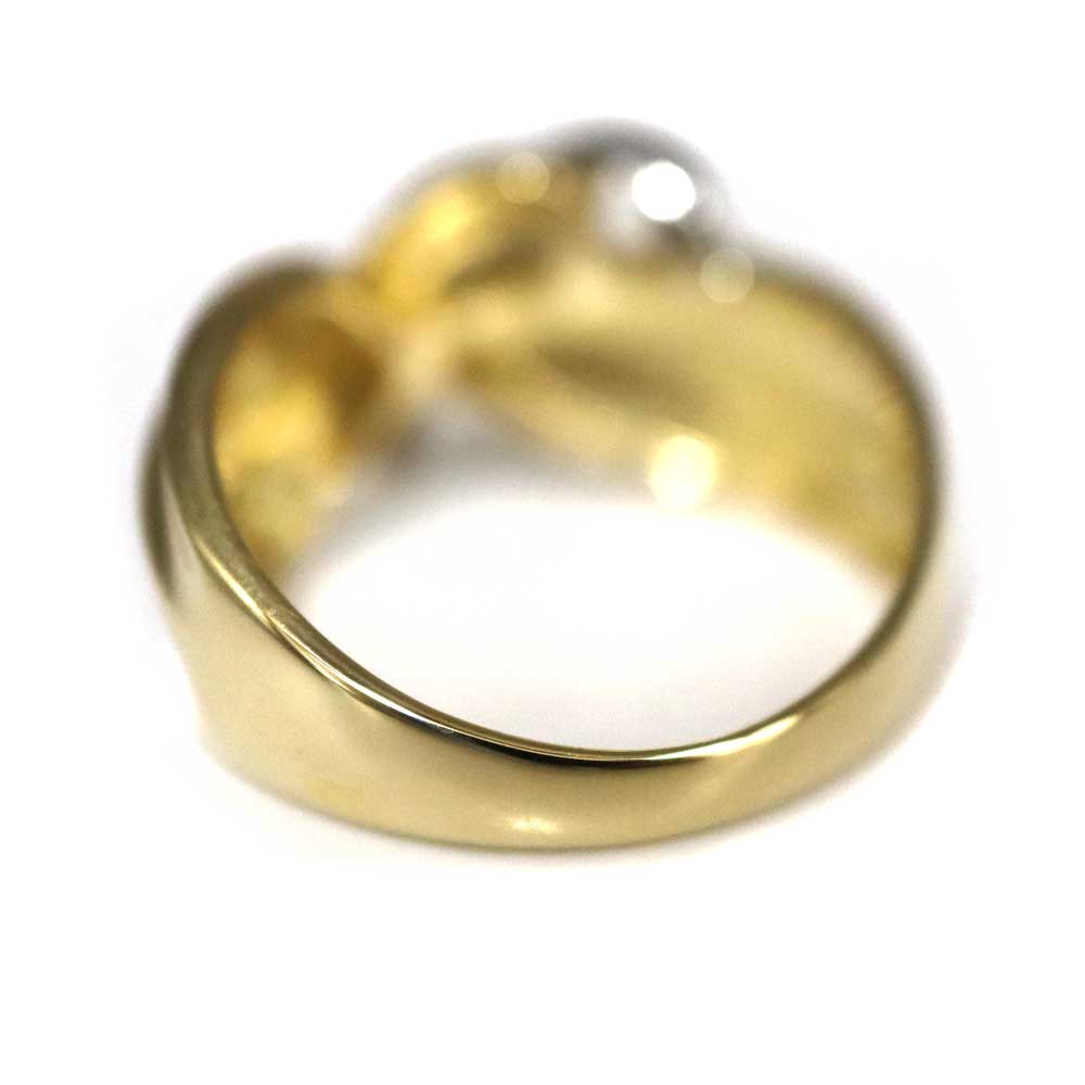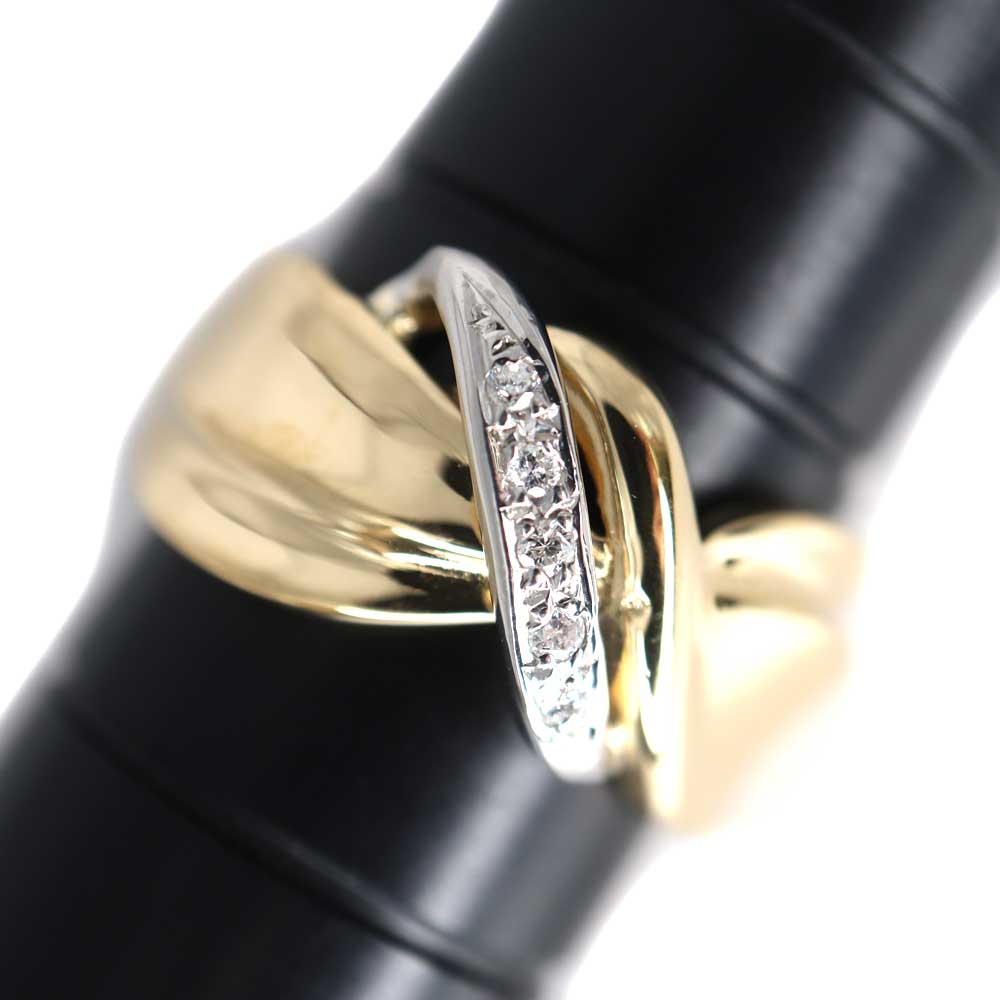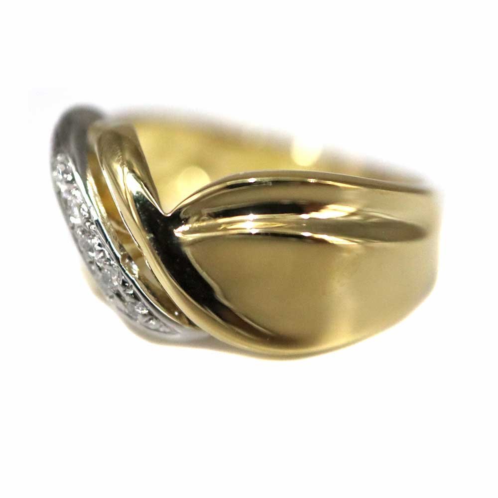 イエローゴールドをベースにプラチナのラインを組み合わせた、立体感のあるリングです。 中央には複数のダイヤモンドがセッティングされており、さりげない輝きが指元を上品に演出します。 流れるように交差するフォルムが特徴で、洗練された印象です。 この機会に是非いかがでしょうか。