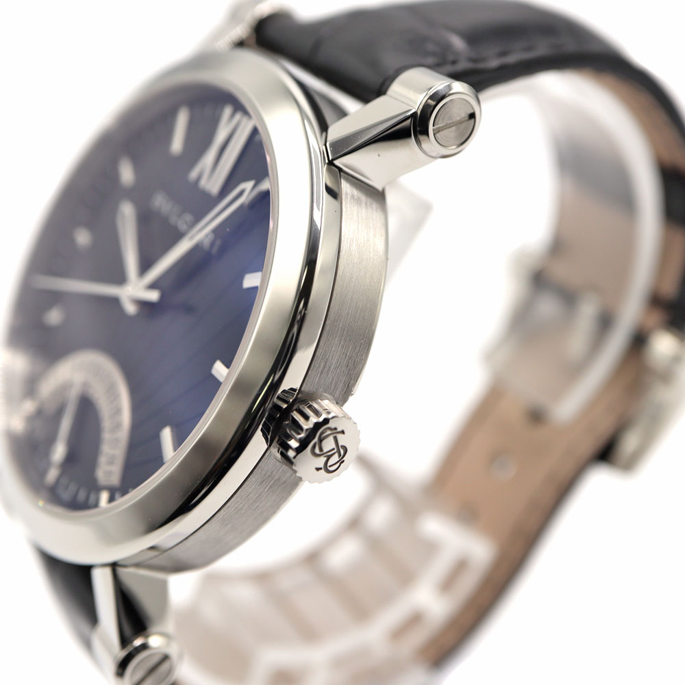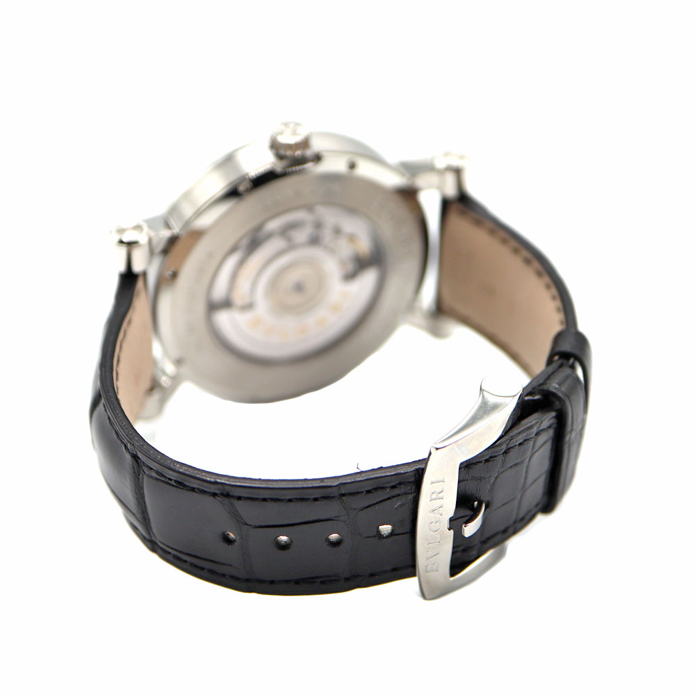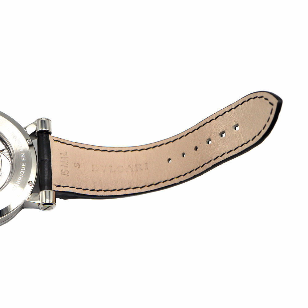 ブルガリの創始者である「ソティリオ・ブルガリ」の名を冠したモデルです。6時位置にレトログラード式ポインターデイトを備えています。 文字盤の扇状の意匠と黒いレザーベルトがシックで大人っぽい印象です。