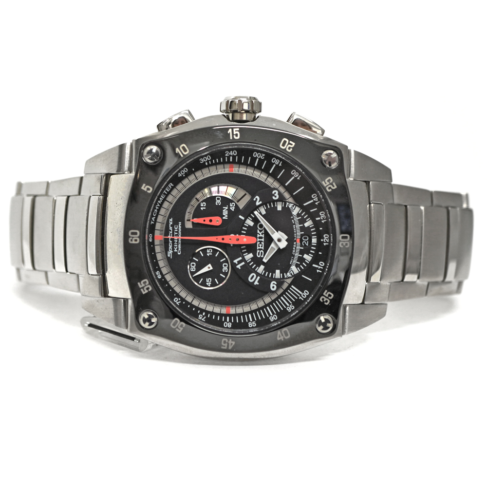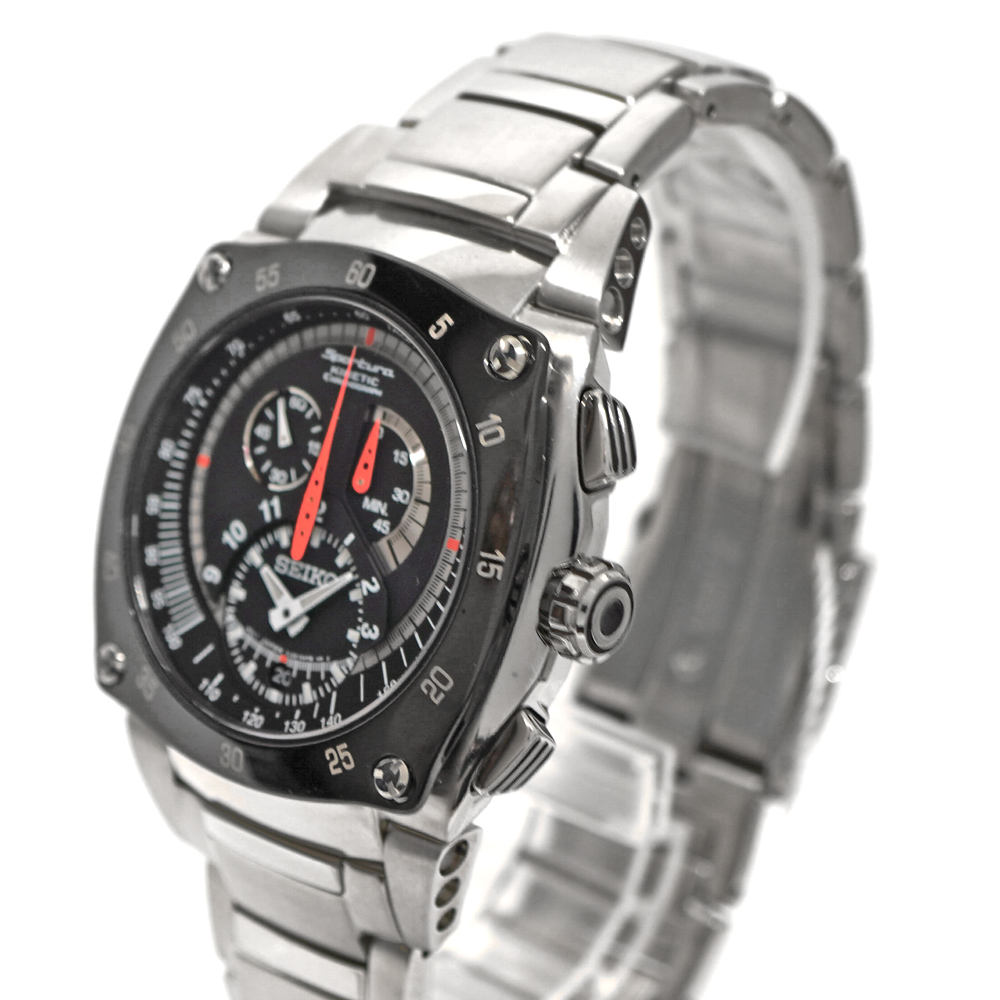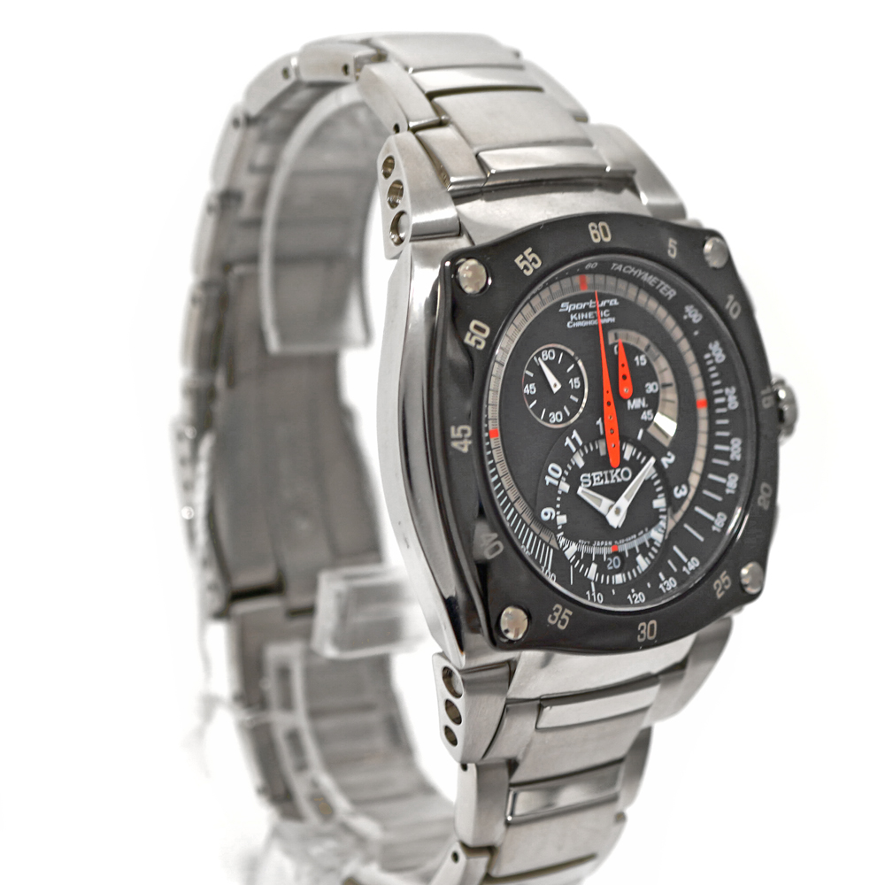 SEIKOの最先端技術を投入して作られたスポーツウォッチです。 ブラックのダイヤルに、オレンジの差し色がとてもスポーティーな仕上がりです。 キネティック 一般のクオーツ腕時計はボタン電池で動きますが、セイコーキネティックは“時計を振る”ことによって内蔵された発電機が回され、発電した電気をキネティックE.S.U.に蓄えて時計を動かすというSEIKO独自の機構をもつクオーツ時計で電池交換の必要はありません。 希少品の為お探しの方はこの機会にぜひいかがでしょうか。 ※尚、当サイトの販売金額より店頭での販売金額の方をお安く設定させて頂いております。予め、ご了承下さいませ。(一部セール品除く) |