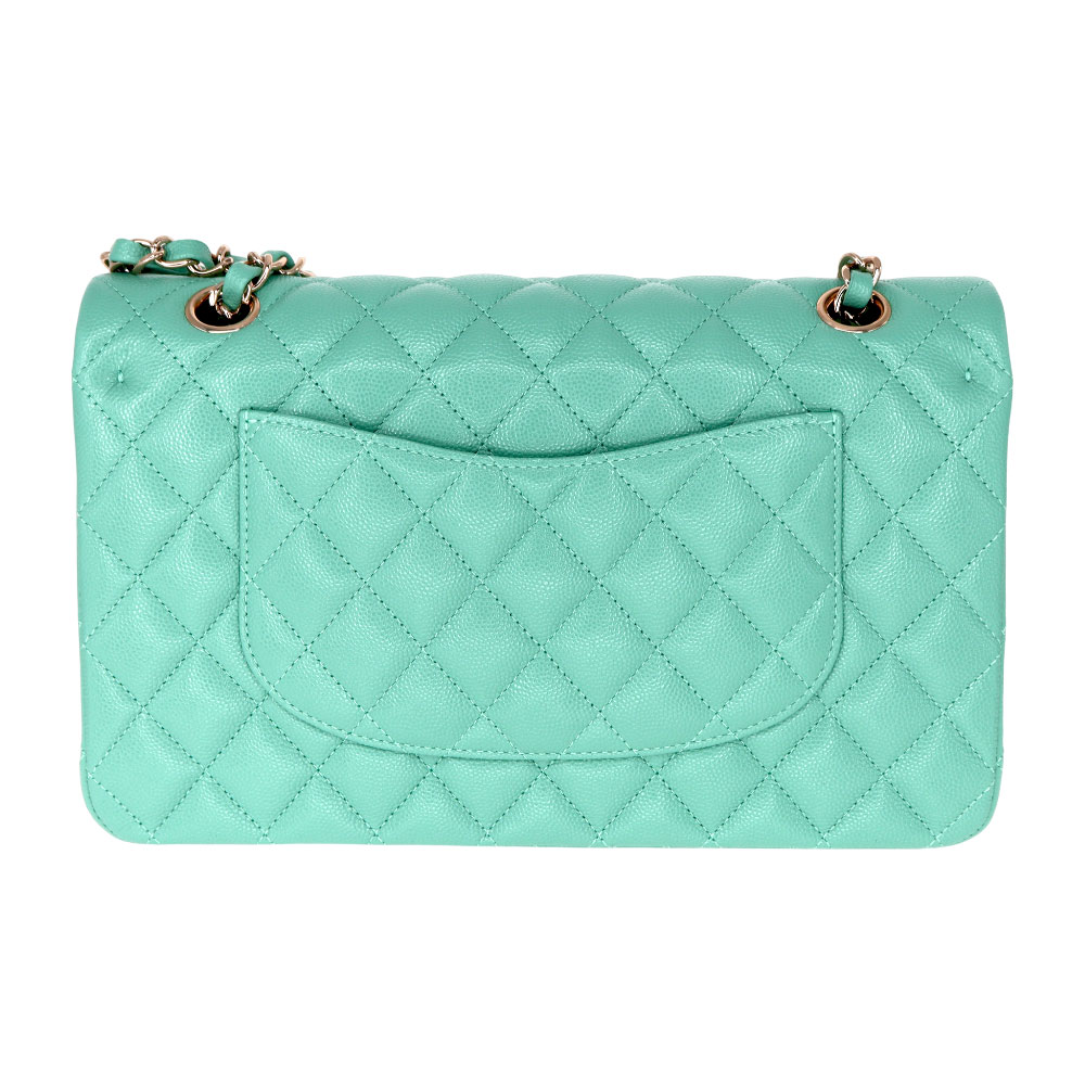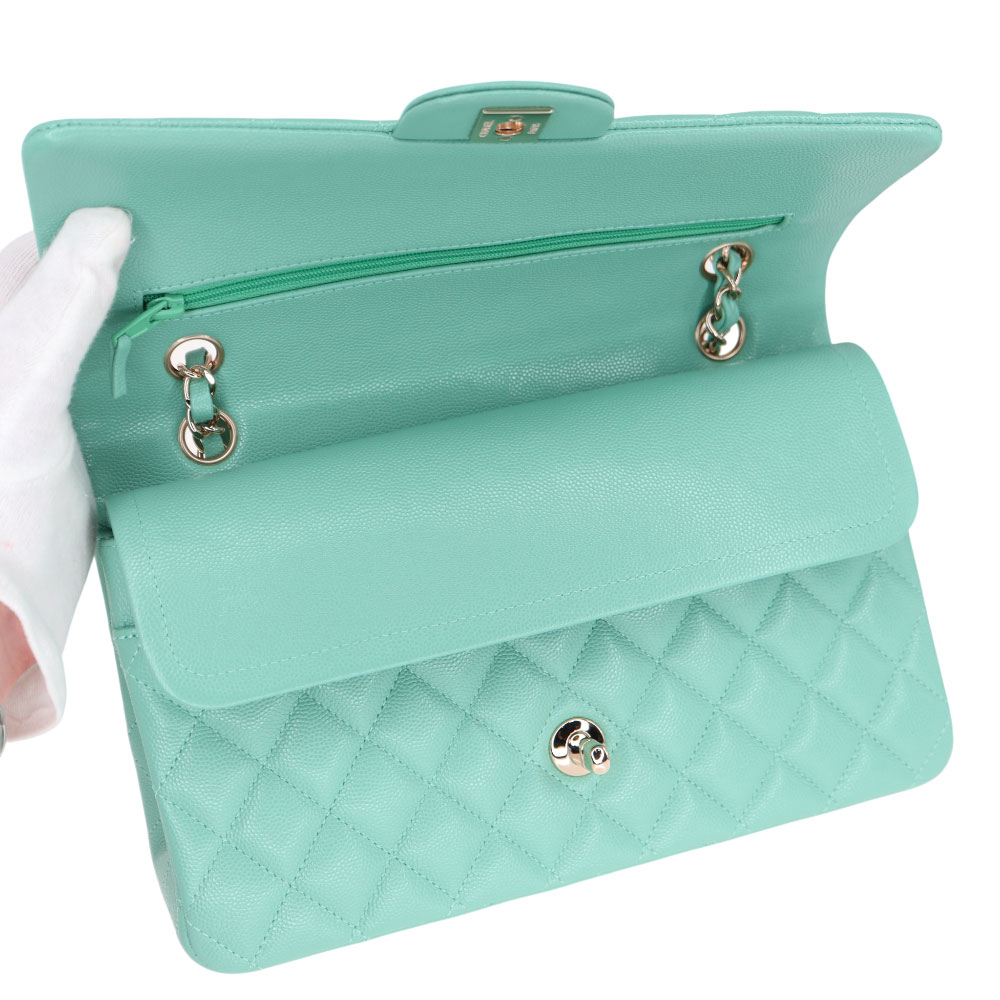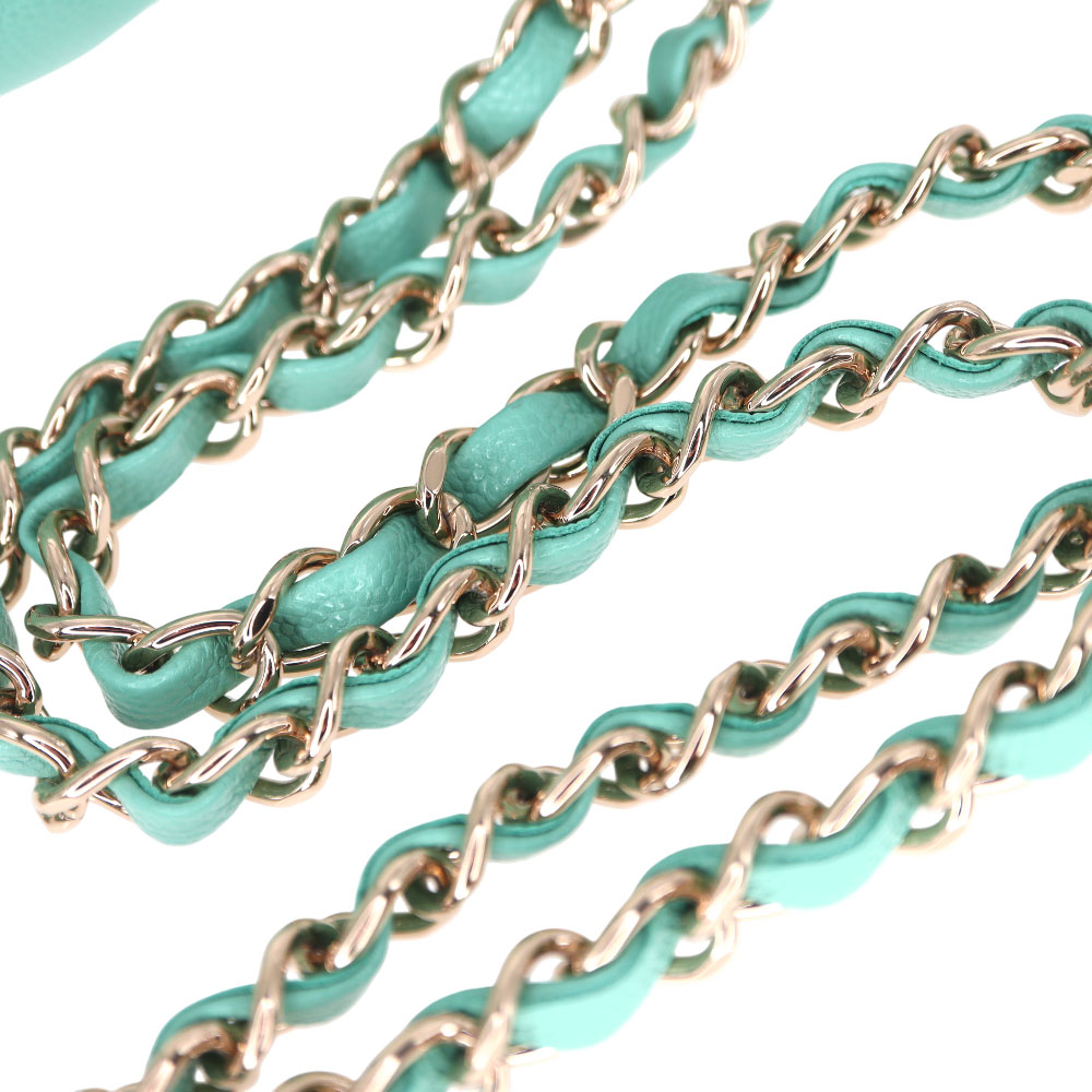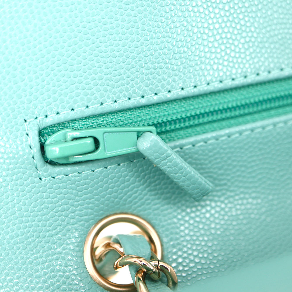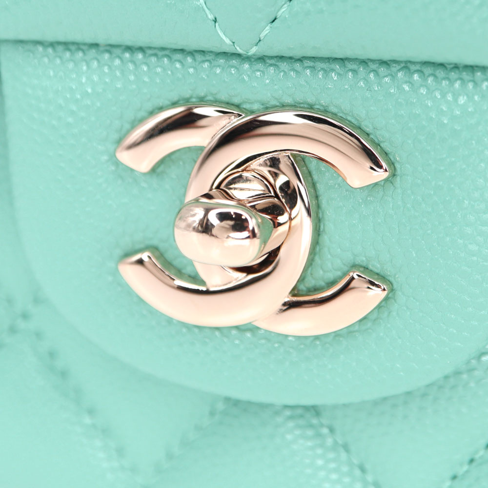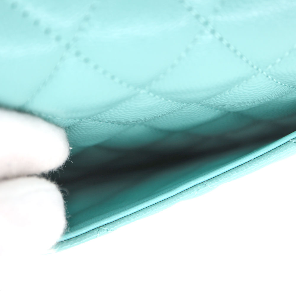 シャネルの定番人気マトラッセ25。 キャビアスキンのタイプで、ダメージに強く高級感のあるお品。 爽やかなレアカラーのティファニーブルーが色鮮やかで目を惹きます。