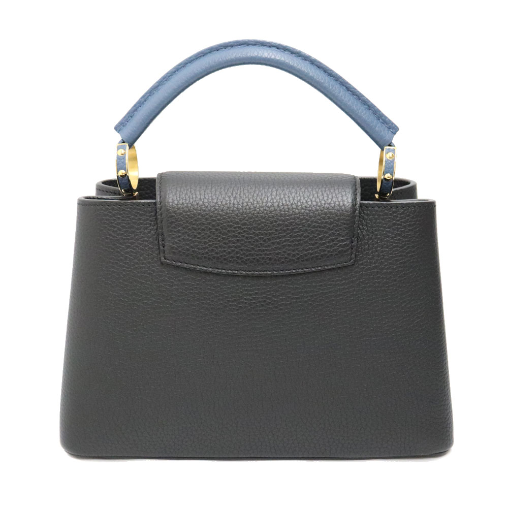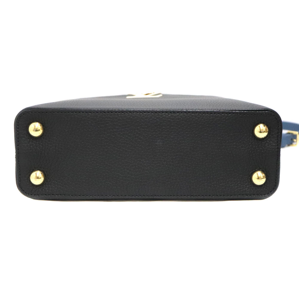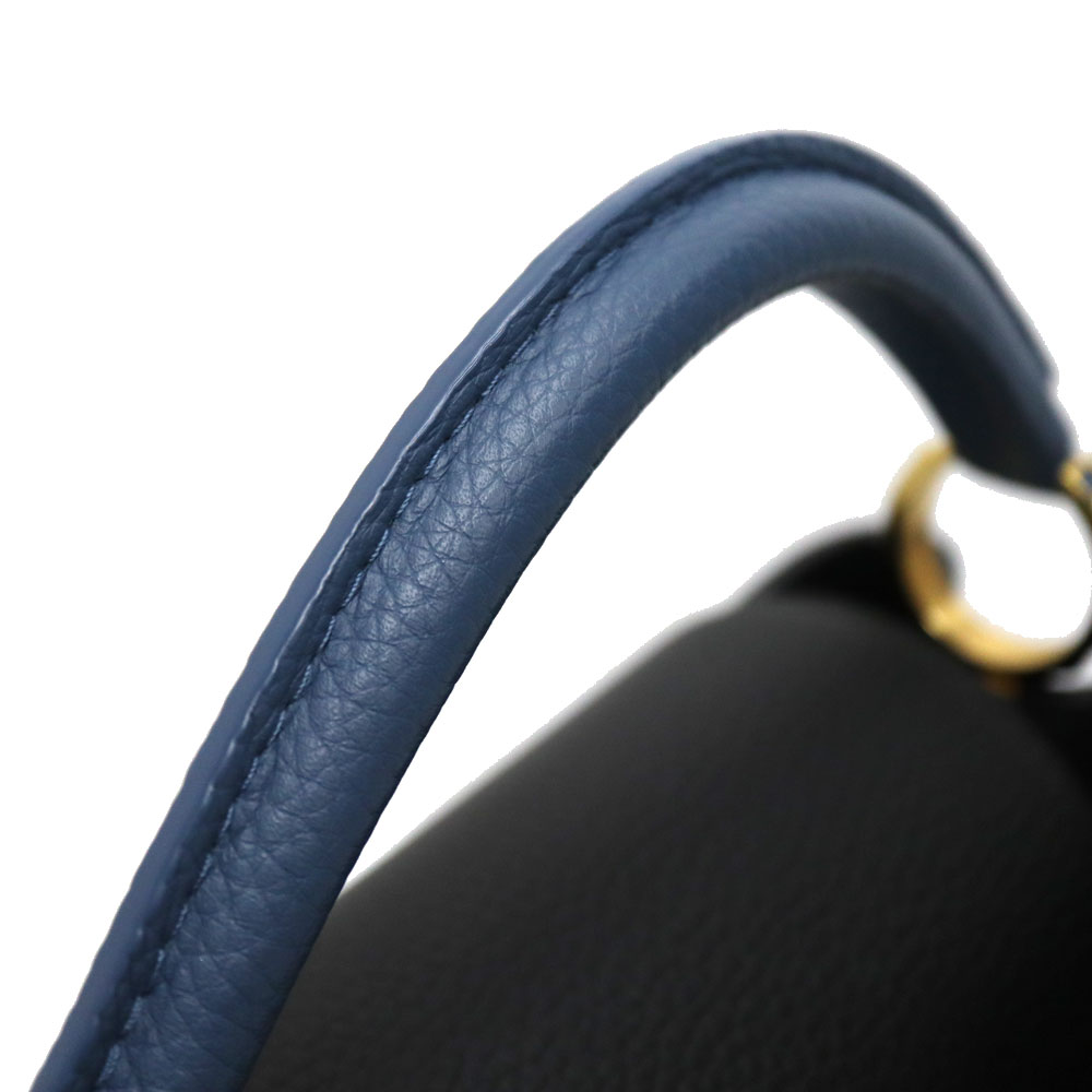 上品で高級感のあるデザインが魅力のカプシーヌ。 こちらはブラック×ブルーのレザーで作られたバッグとなっております。 ハンドバッグとショルダーバッグ2WAYで活躍するお品物です。 この機会に是非いかがでしょうか。