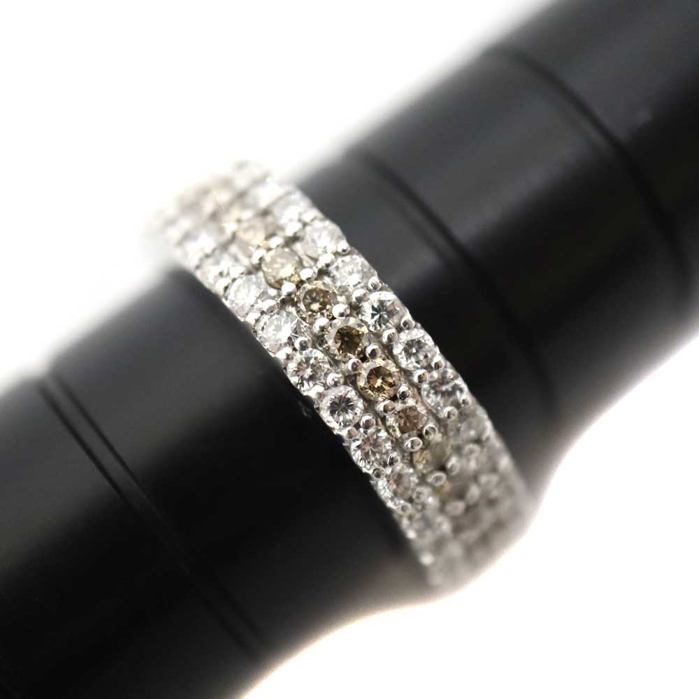 1.08ctのダイヤモンドの輝きが指元を美しく彩る、ラグジュアリーなリングです。 中央には落ち着いたシャンパンカラーのダイヤモンドが配され、上下のダイヤモンドとのコントラストが、洗練された印象を演出してくれます。 気品と存在感を兼ね備えた一本です。 この機会に是非いかがでしょうか。