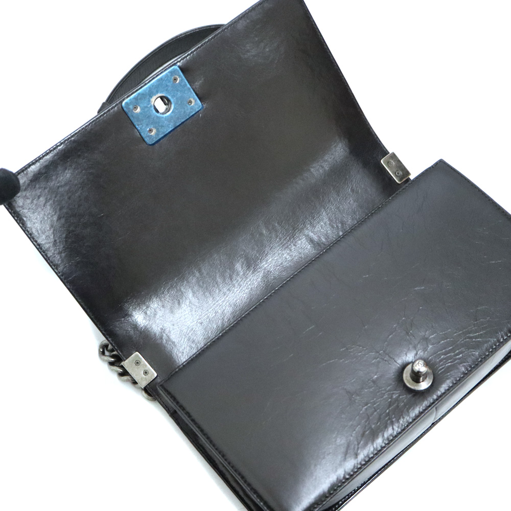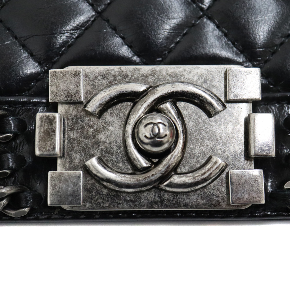 ボーイシャネルというと黒くくすみ仕様となっている金具が特徴で、 開閉部分の横長の大きな金具もインパクトがあります。 バッグまわりのチェーンデザインも個性的ですよ。 ぜひいかがでしょうか。