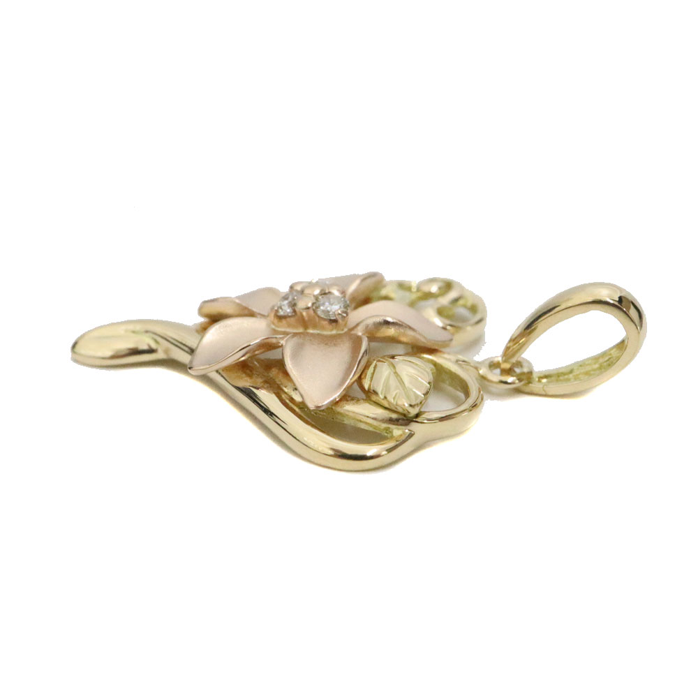 フラワーモチーフがデザインされたペンダントトップです。 2色のゴールドとダイヤモンドもはめこまれ細かな装飾が美しいアイテムとなっております。 この機会に是非いかがでしょうか。