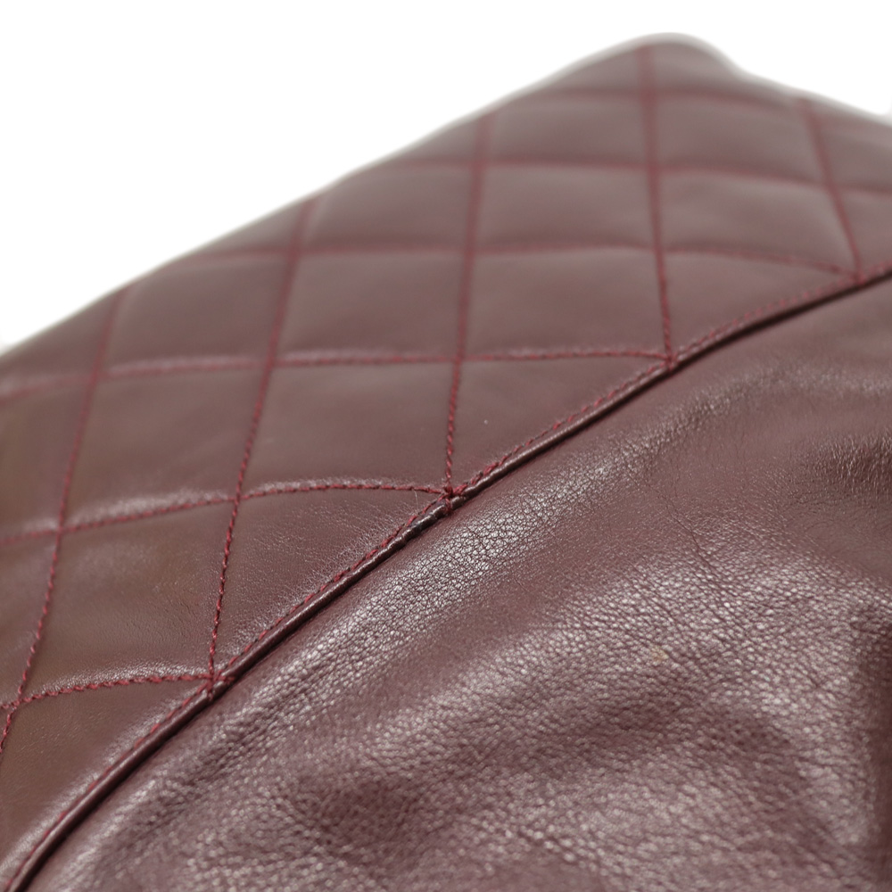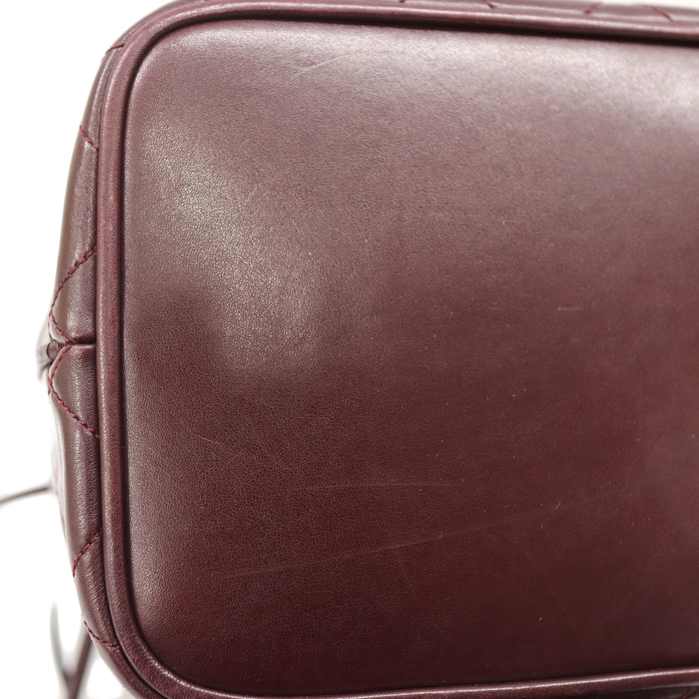 全面に使用されたボルドーカラーが目を惹くバッグです。 開閉用のひもにはココマークがデザインされた金具がついており、シャネルらしいデザインとなっております。 巾着開閉式のため、開けやすく普段使いにおすすめです。 お探しの方はこの機会にぜひいかがでしょうか。