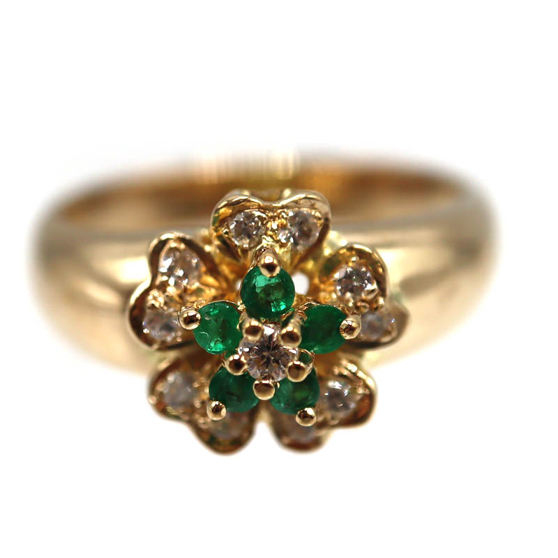 鮮やかなグリーンが美しいエメラルド0.18ctと、ダイヤモンド0.19ctをあしらったK18リングです。