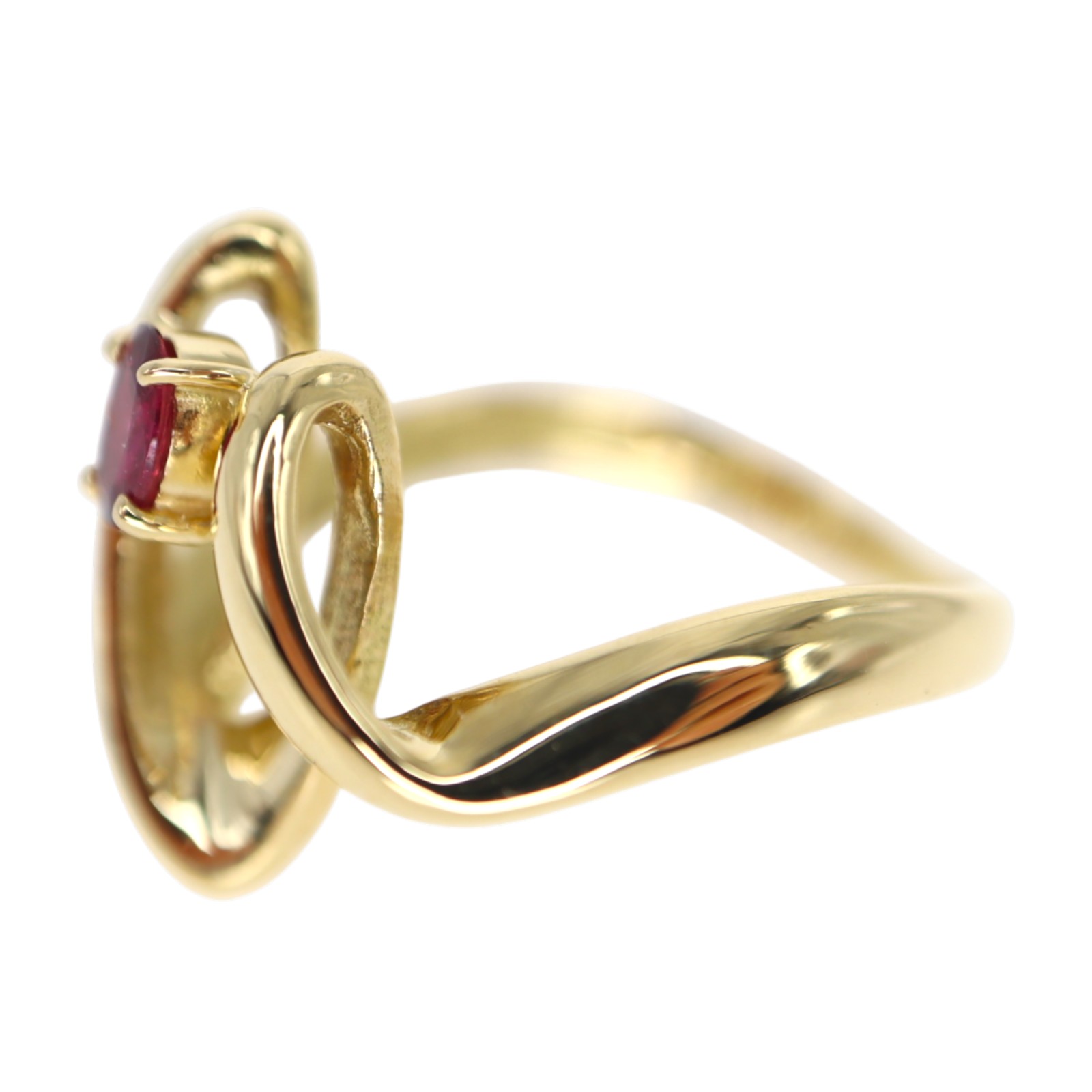 個性的なデザインに一粒のルビーが輝く指輪です。小ぶりな3粒のダイヤモンドもセッティングされているので、控えめながらも上品さがあります。