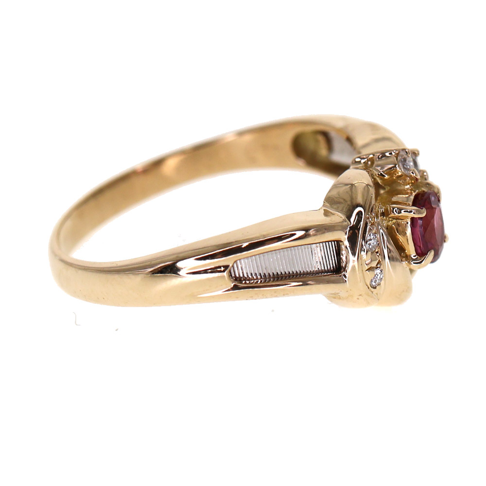 コンビデザインのルビーとダイヤモンドを使用したリングです。 ルビーの少し上にリボンのようにダイヤモンドがセッティングされた かわいらしいリングです。 この機会に是非いかがでしょうか。
