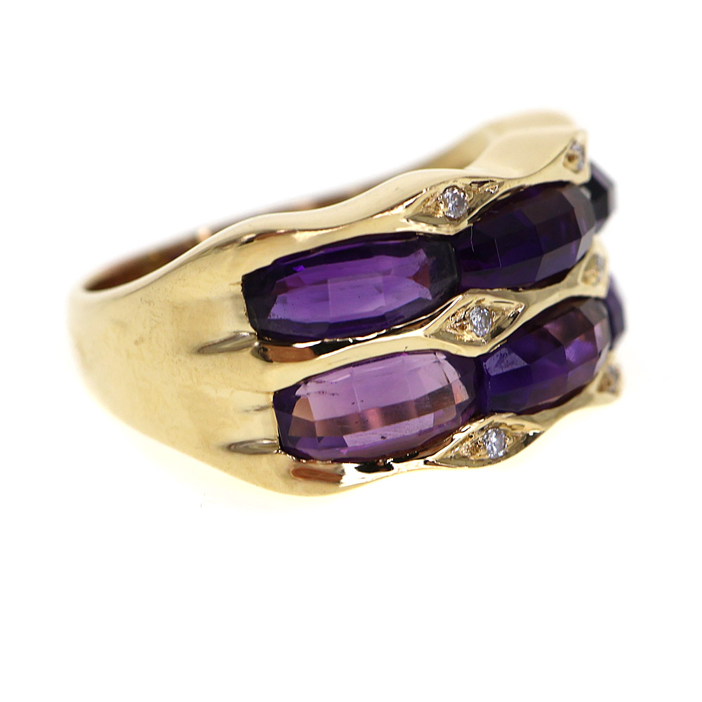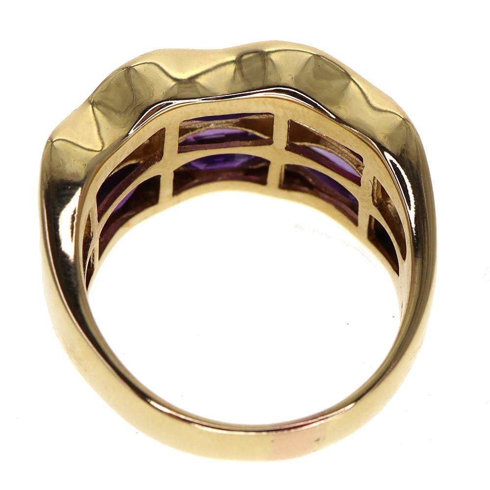 大ぶりのアメシストが大胆なカットでセッティングされたリングです。 お手元を華やかに演出してくれますよ。 この機会に是非いかがでしょうか。