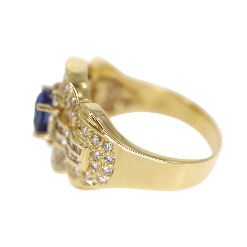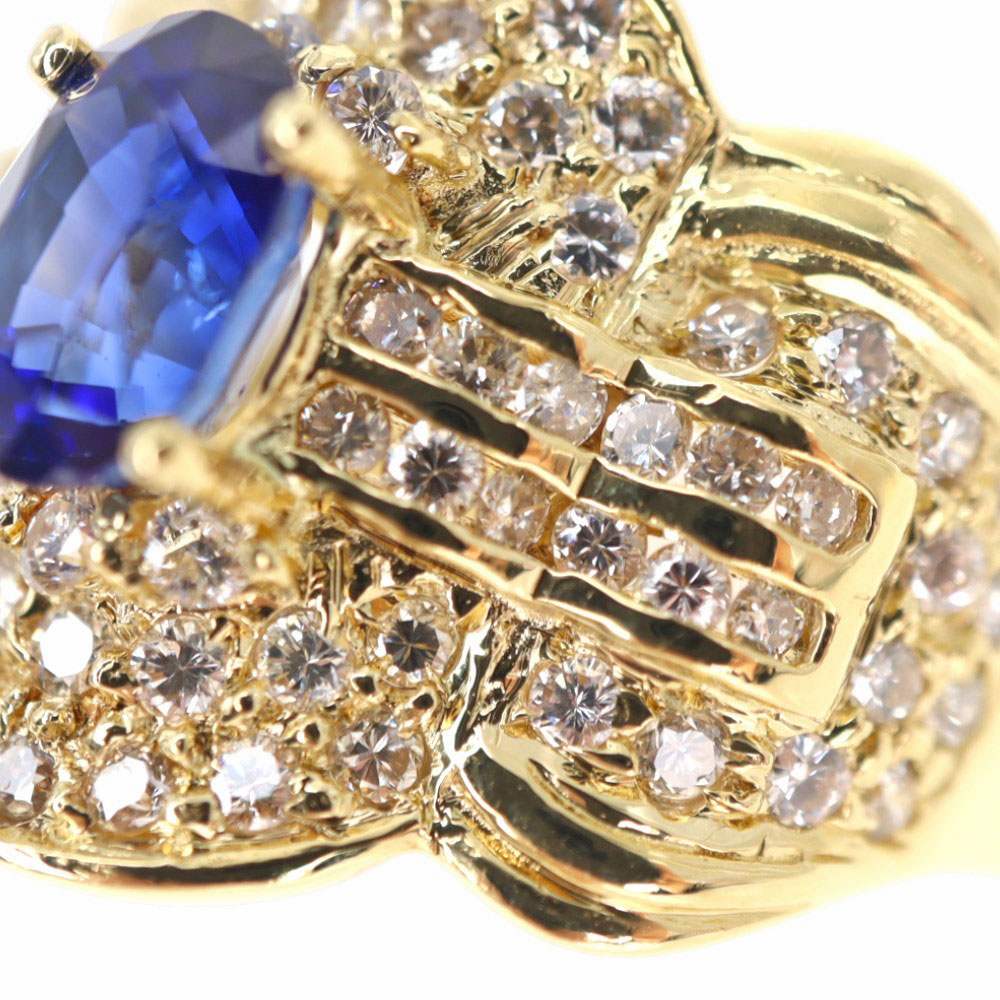 煌びやかにセットされたダイヤモンドがサファイアの美しさを引き立てている指輪です。 中央にセッティングされたサファイアと、それを囲うダイヤモンドがボリューミーでゴージャスさを演出します。