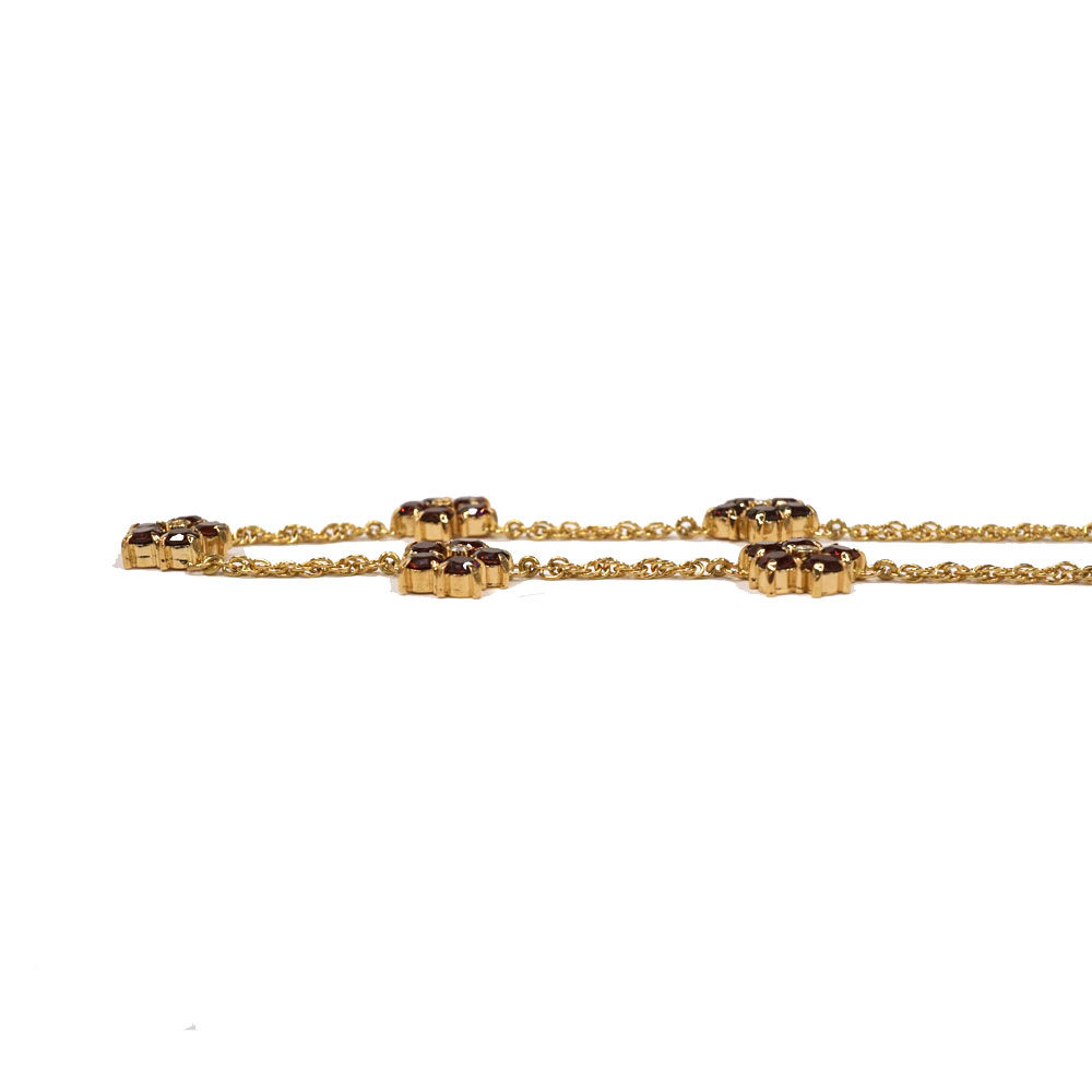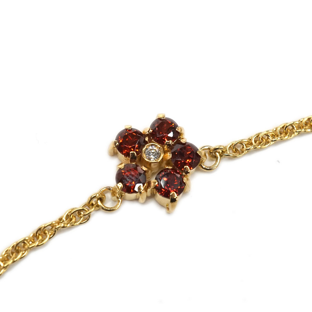 ガーネットとダイヤモンドがセッティングされたフラワーモチーフのネックレスです。 モチーフが5Pあり華やかな印象です。 首元のアクセントにいかがでしょうか。