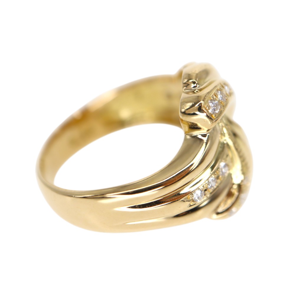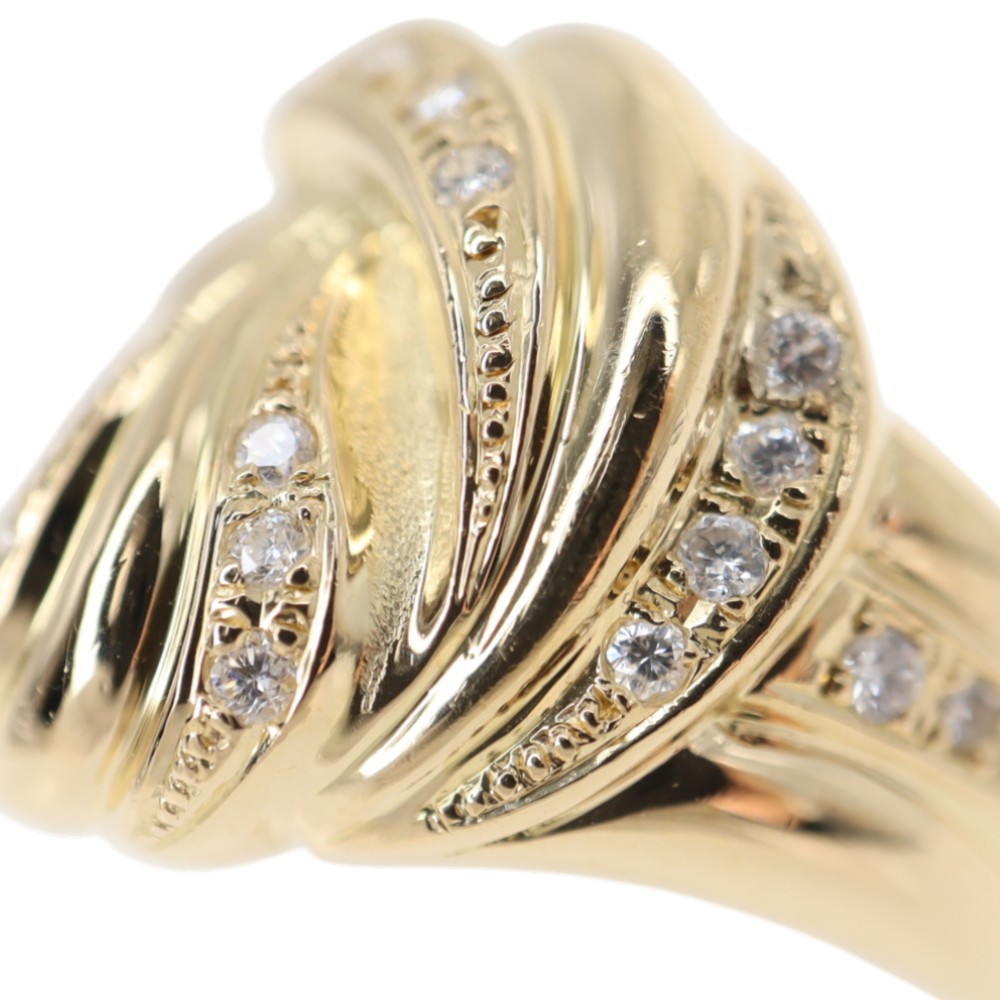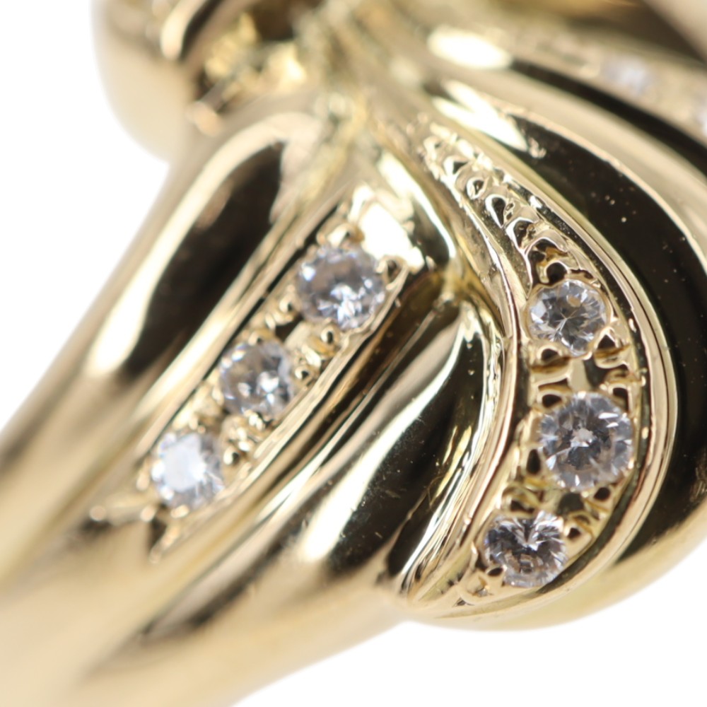 ゴールドのリボンが結ばれたようなデザインで、ボリューム感がある指輪です。 ダイヤモンドが埋め込まれているので、キラキラと反射し美しい輝きを放ちます。