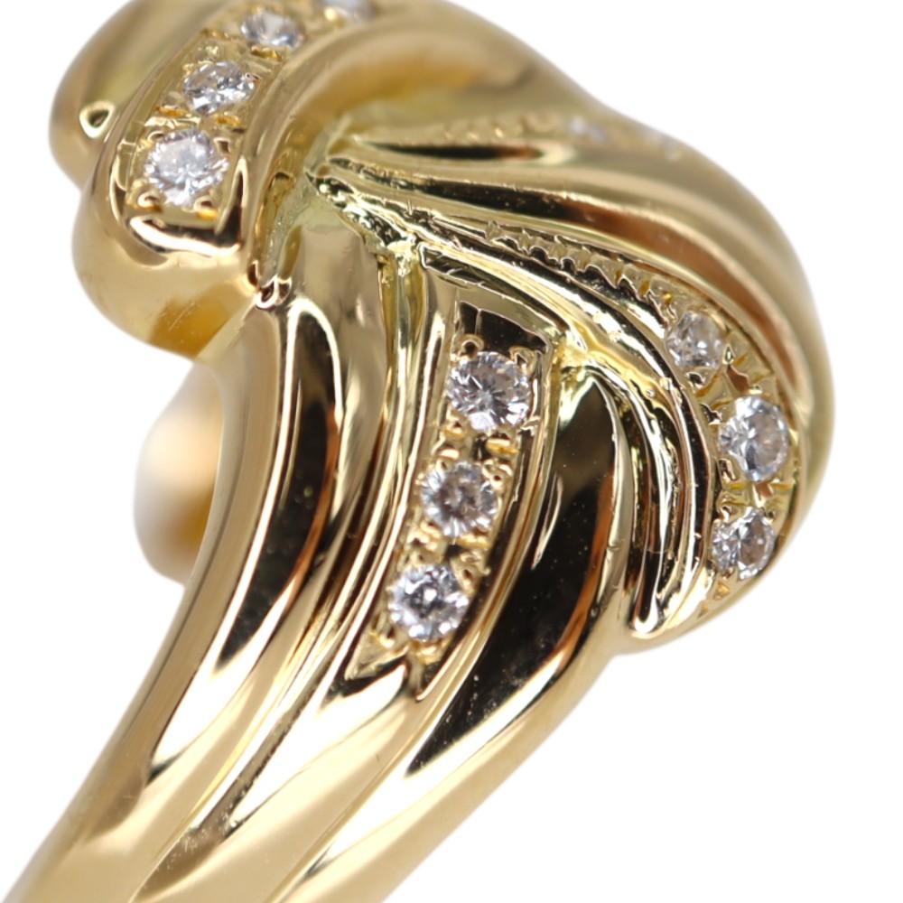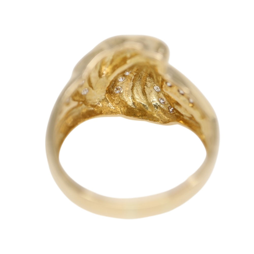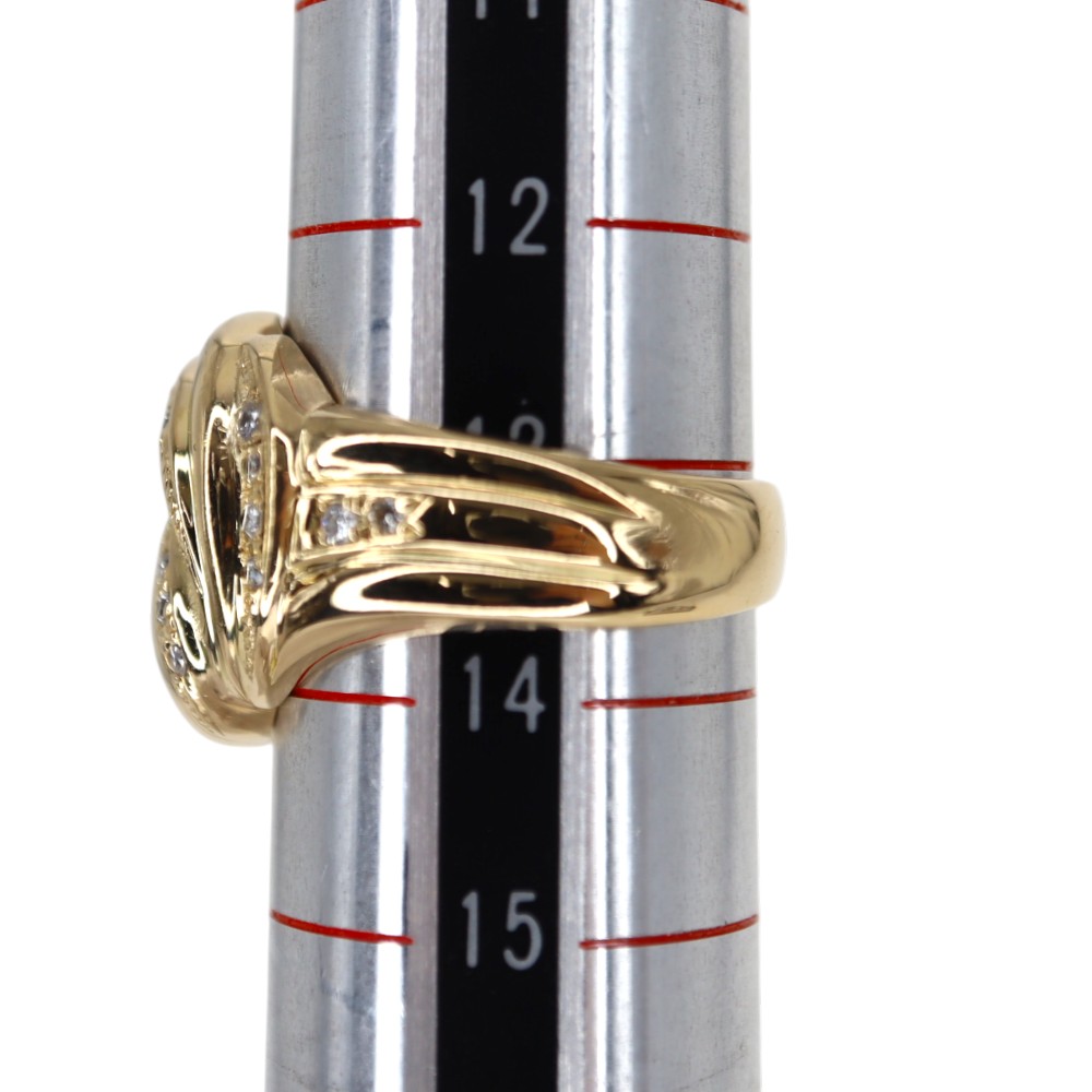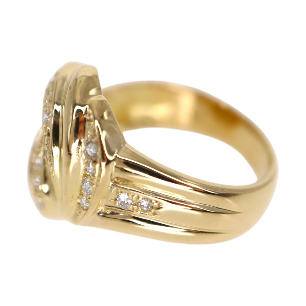 ゴールドのリボンが結ばれたようなデザインで、ボリューム感がある指輪です。 ダイヤモンドが埋め込まれているので、キラキラと反射し美しい輝きを放ちます。