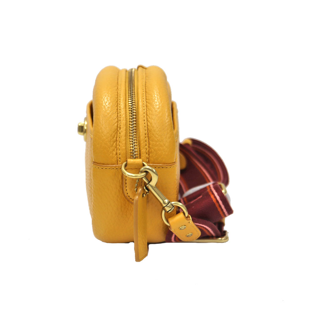 鮮やかなイエローカラーが目を惹く、コンパクトで可愛らしいカメラバッグです。 ころんとした丸みのあるフォルムに、フロントのターンロック金具がアクセントとなり、シンプルながらも上品な印象に仕上がっています。 小ぶりなサイズ感ながら収納力もあり、ちょっとしたお出かけやデイリー使いにぴったり。コーディネートの差し色としても活躍してくれるアイテムです。