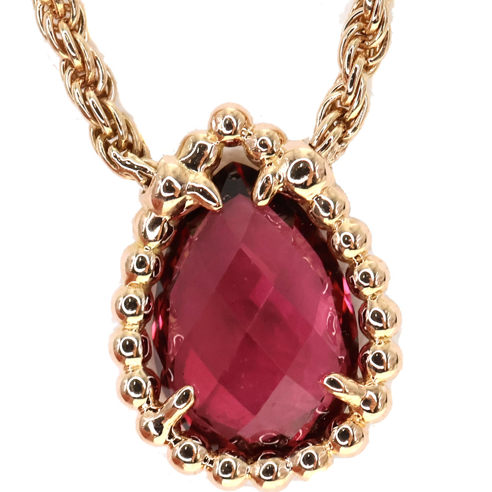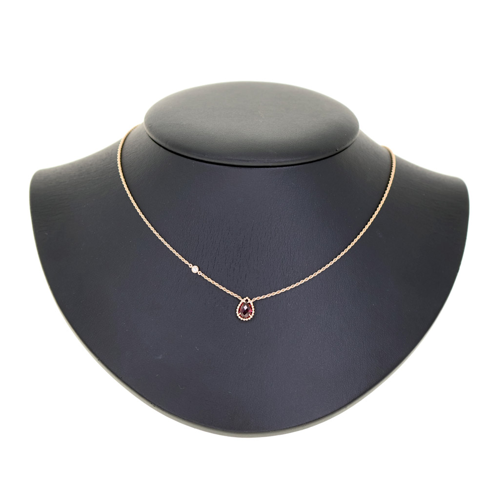 フランスの名門ジュエラー、ブシュロンによる「セルパンボエム」コレクションのエクストラスモールサイズペンダントです。 18Kピンクゴールド製の繊細なツイストチェーンに、ペアシェイプのロードライトガーネット(約1.40ct)とラウンドカットダイヤモンド(0.03ct)があしらわれています。 スネークの神秘的な美しさを象徴するドロップモチーフが胸元に優雅な輝きを添えます。 この機会にぜひいかがでしょうか。