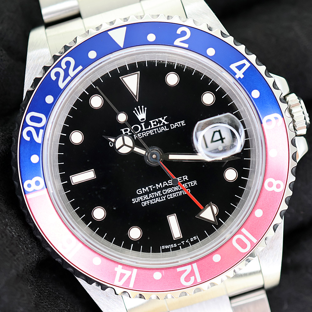ロレックスの中でもパイロットウォッチに位置づけられるモデルです。 GMT針を搭載しており、このGMTマスターは2か国の時間を表示する事が可能です。 ムーブメントはCal.3175の為、カレンダーのクイックチェンジが可能で操作性にも優れています。 独特なカラーリングで目を惹く一本です。