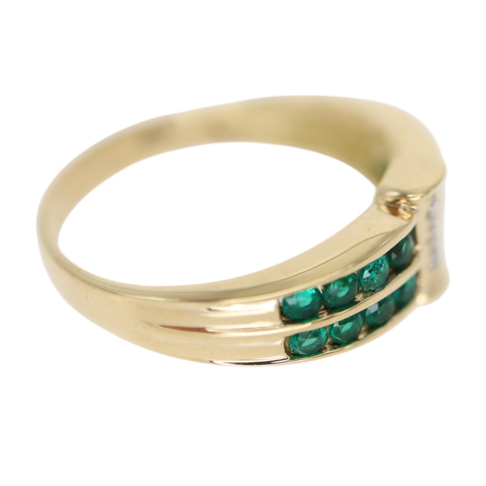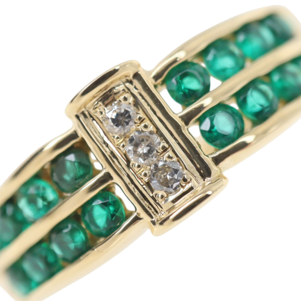 上下2列に施されたエメラルドが目を惹くリングです。 ダイヤモンドもセッティングされているので、よりゴージャスさを感じることができます。