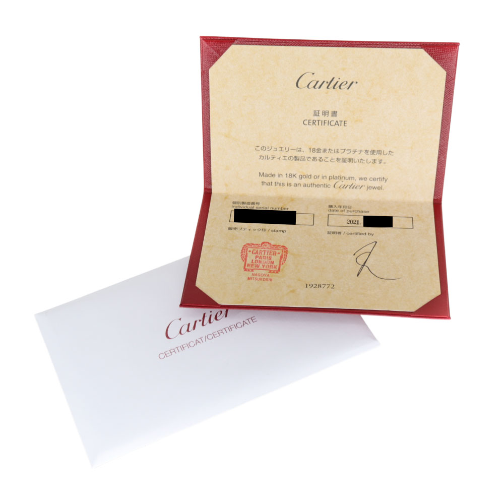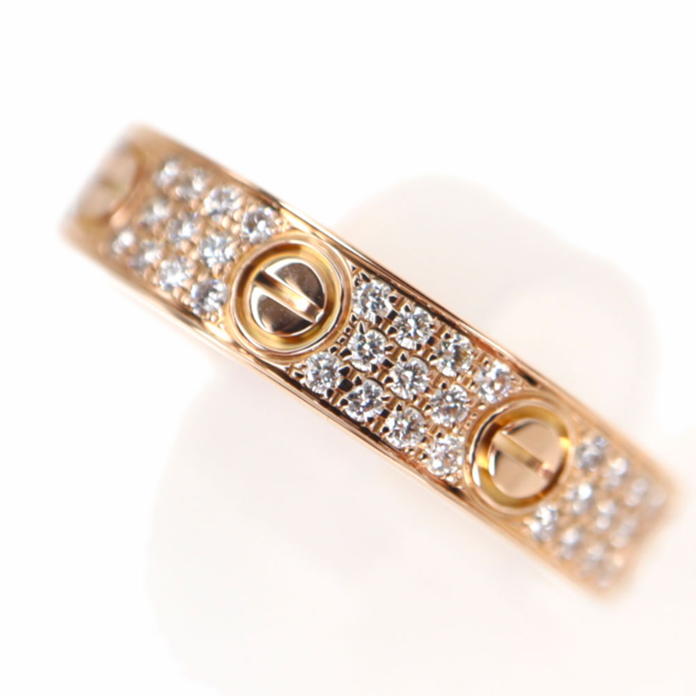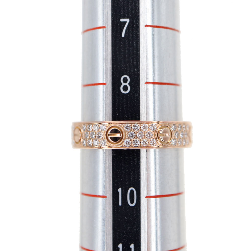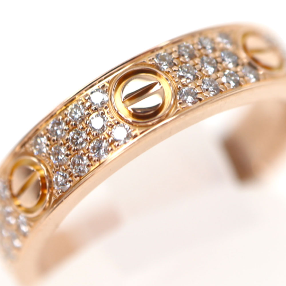 カルティエの中では定番のビスがモチーフになっているLOVEコレクションの一つです。 全面にあしらわれたダイヤモンドが美しいリングです。 柔らかいピンクゴールドとダイヤモンドのゴージャスさが華やかな雰囲気を演出しています。