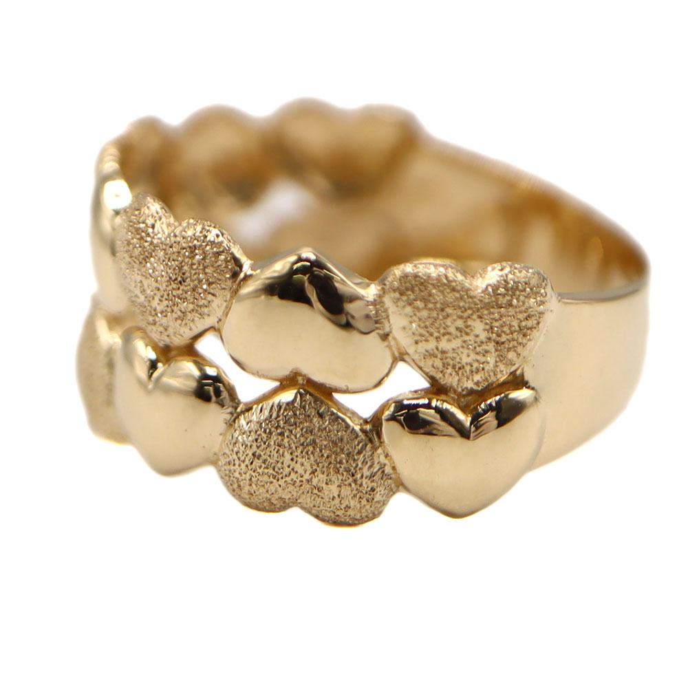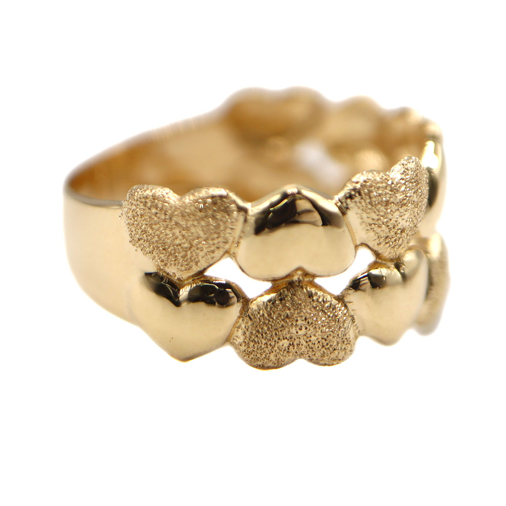 ハートモチーフがあふれる可愛らしいデザインのリングです。 ハートはポリッシュと点描の様な凹凸でアクセントが入ったものが交互に組み合わさっており、コーディネートに華やかさをプラスしてくれます。 この機会に是非いかがでしょうか。