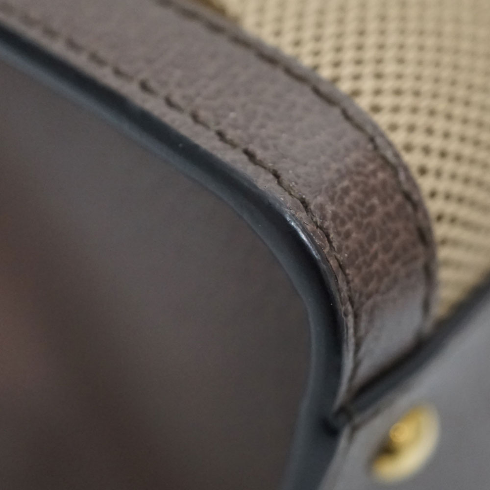 キャンバスとレザーにゴールドの金具が映える、おしゃれなハンドバッグです。