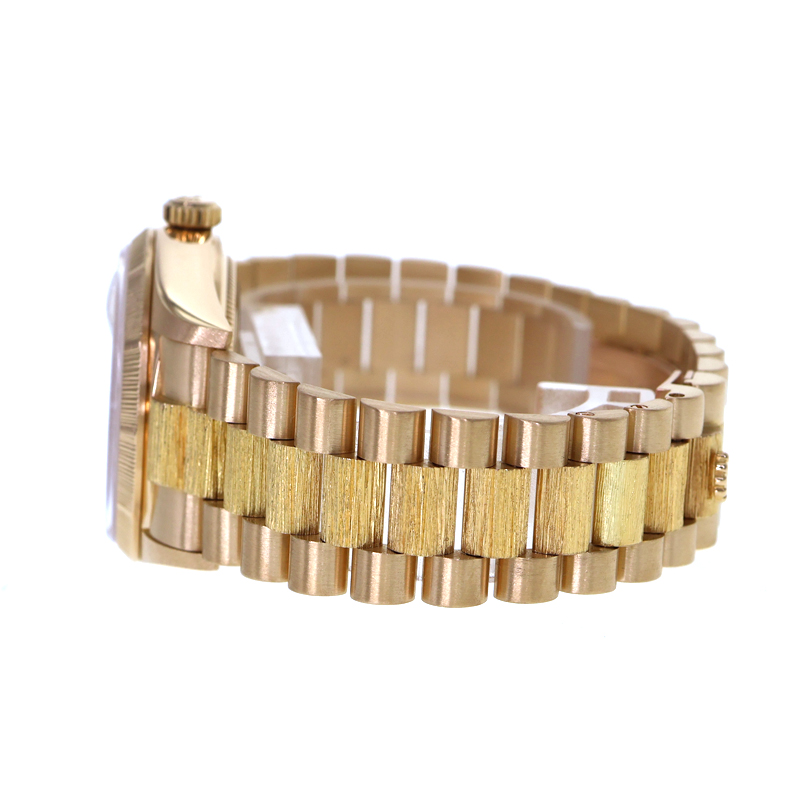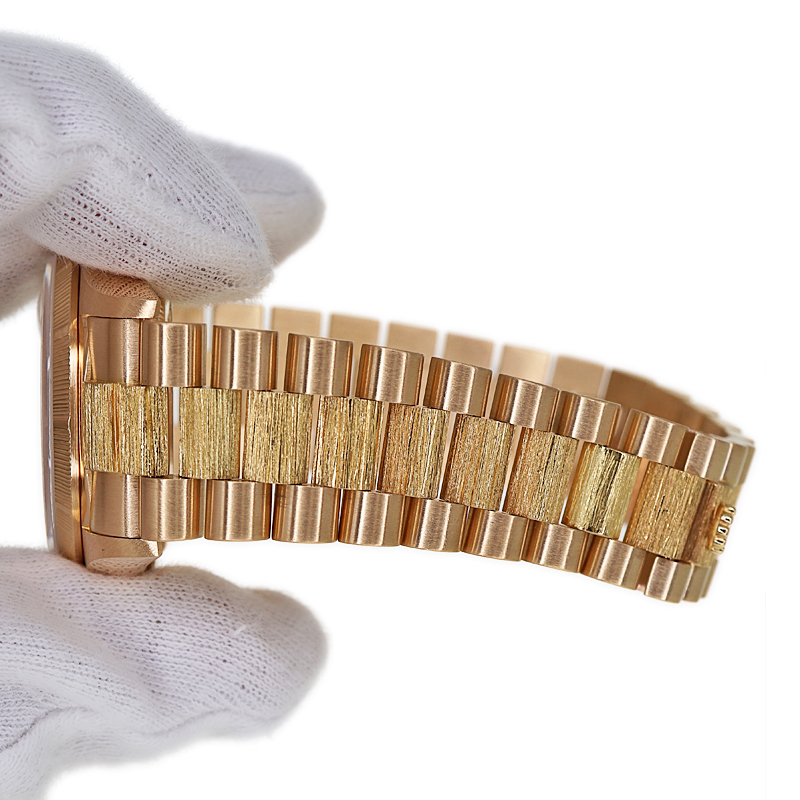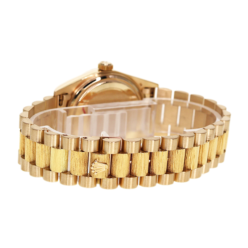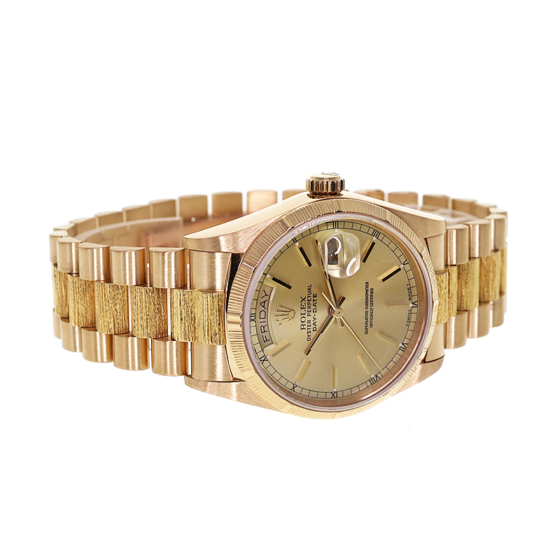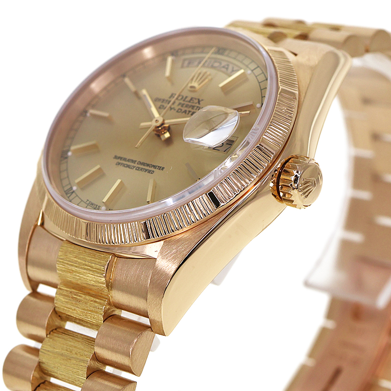 1956年の誕生以来、ロレックス・オイスターの頂点に君臨し続ける「デイデイト」。 K18イエローゴールドを惜しみなく使用したその佇まいは、フラッグシップに相応しい圧倒的な重厚感を放ちます。 本個体の最大の特徴は、熟練の職人技を想起させる「バーク(樹皮)仕上げ」のベゼルです。 定番のフルーテッドベゼルとは一線を画す、有機的で落ち着いた煌めきは、見る者に知性と個性を印象付けます。 文字盤は気品溢れるオリジナルシャンパンゴールド。 ムーブメントには、実用性を高めるクイックチェンジデイト機能を備えたハイビート仕様の「Cal.3055」を搭載。 ヴィンテージの風合いと日常使いの利便性が高次元で融合した、まさに一生モノと呼ぶにふさわしい逸品です。