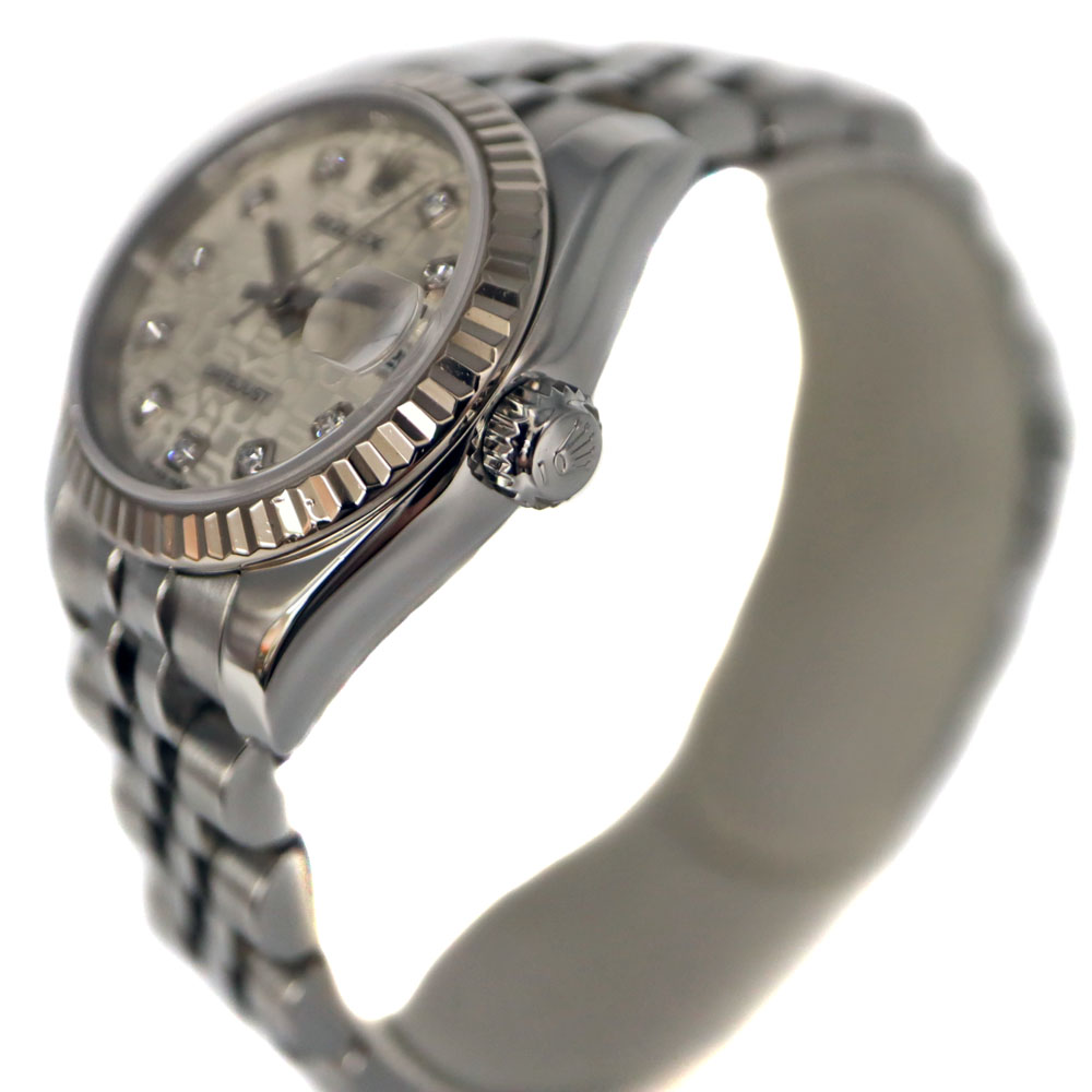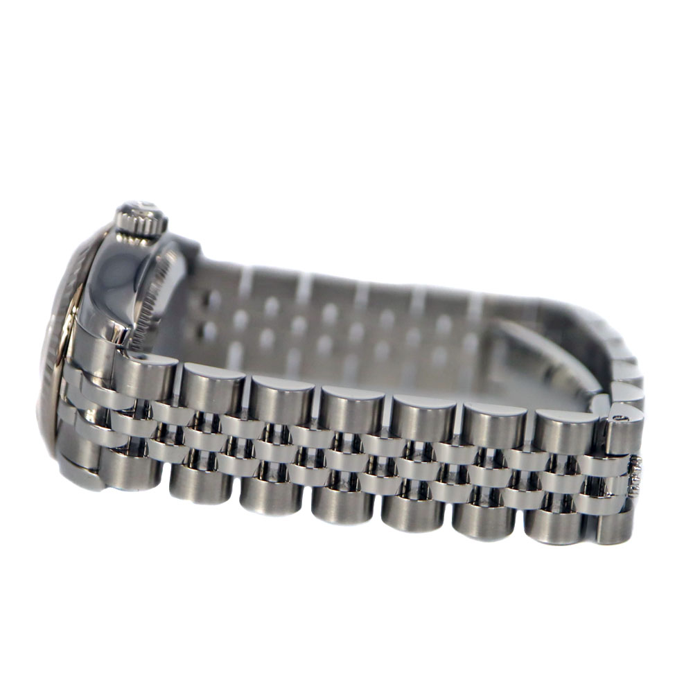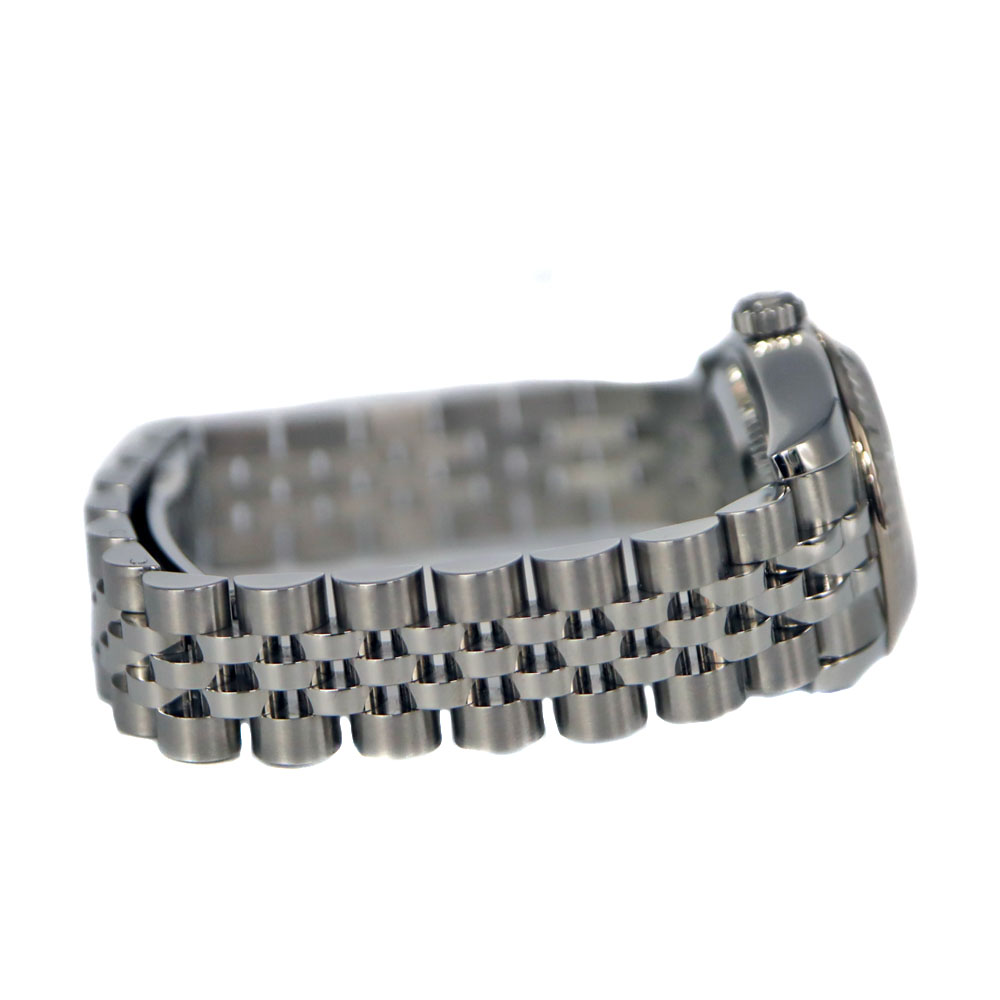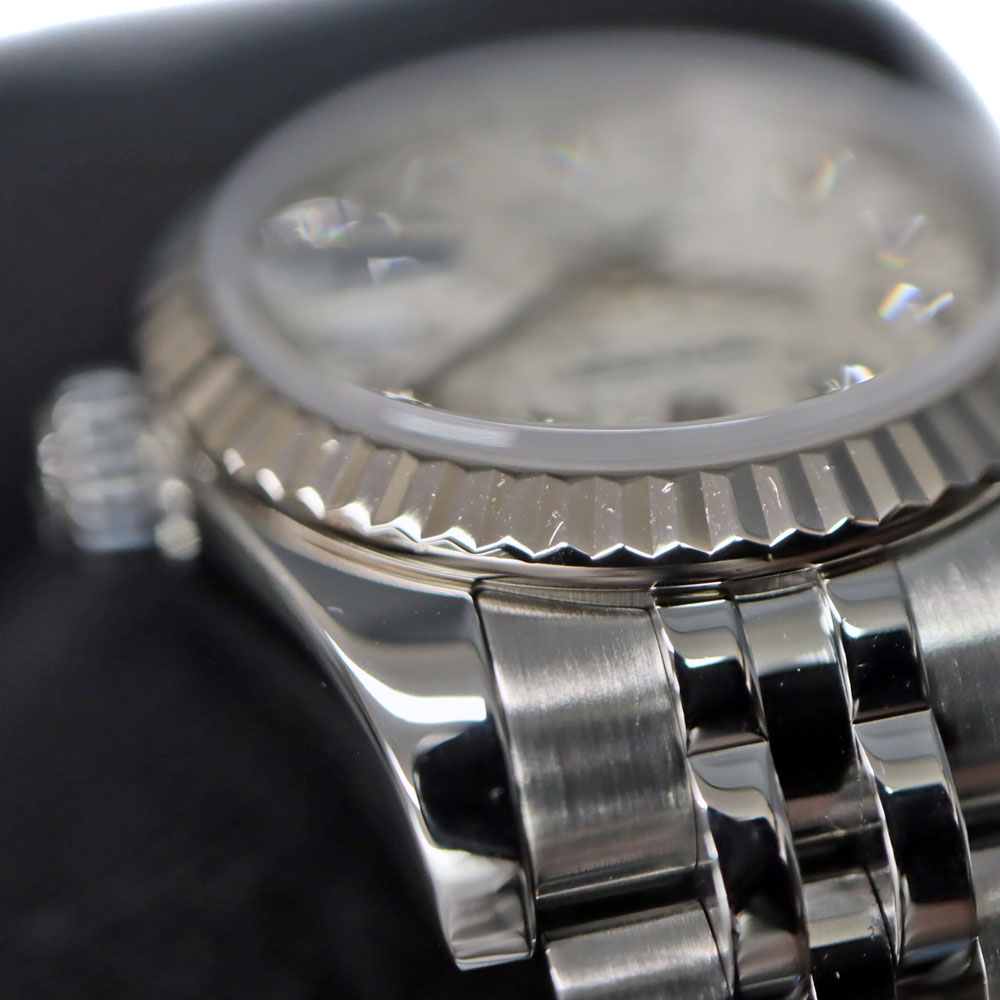 デイトジャストとは午前0時頃瞬時に日付が変わるデイトジャスト機構、全回転式ローターを搭載したパーペチュアル機構、ロレックス三大機構を搭載したモデル。 美しいカッティングが施されたフルーテッドベゼルとブレスレット中央パーツにホワイトゴールドを使用したラグジュアリー感溢れるモデルですので、手元を華やかにしてくれます。 今回は文字盤に10ポイントのダイヤモンドと文字盤に「ROLEX」と刻まれたコンピュータ文字盤となっており、通常モデルよりもよりロレックスを感じられる仕様となっております。