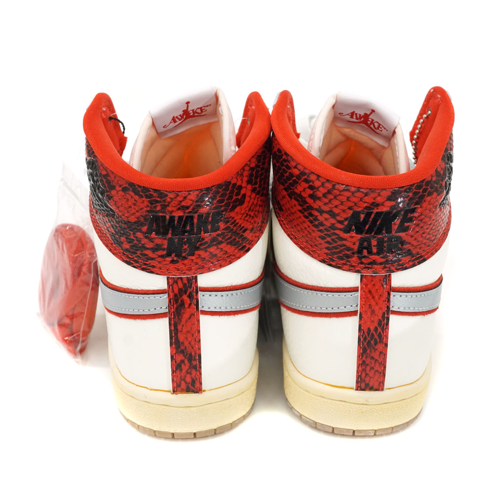 このモデルにセイルのレザーアッパーとスネークスキンのアクセントに加え、ブルズのチームカラーであるレッドをあわせ、シュータンラベルに入った2つのブランドのロゴ、マッドガードにステッチされた"AWAKE NY"の特徴的な「A」のロゴ、ヒールは"AWAKE NY"刻印されたスペシャルエディションとなっています。