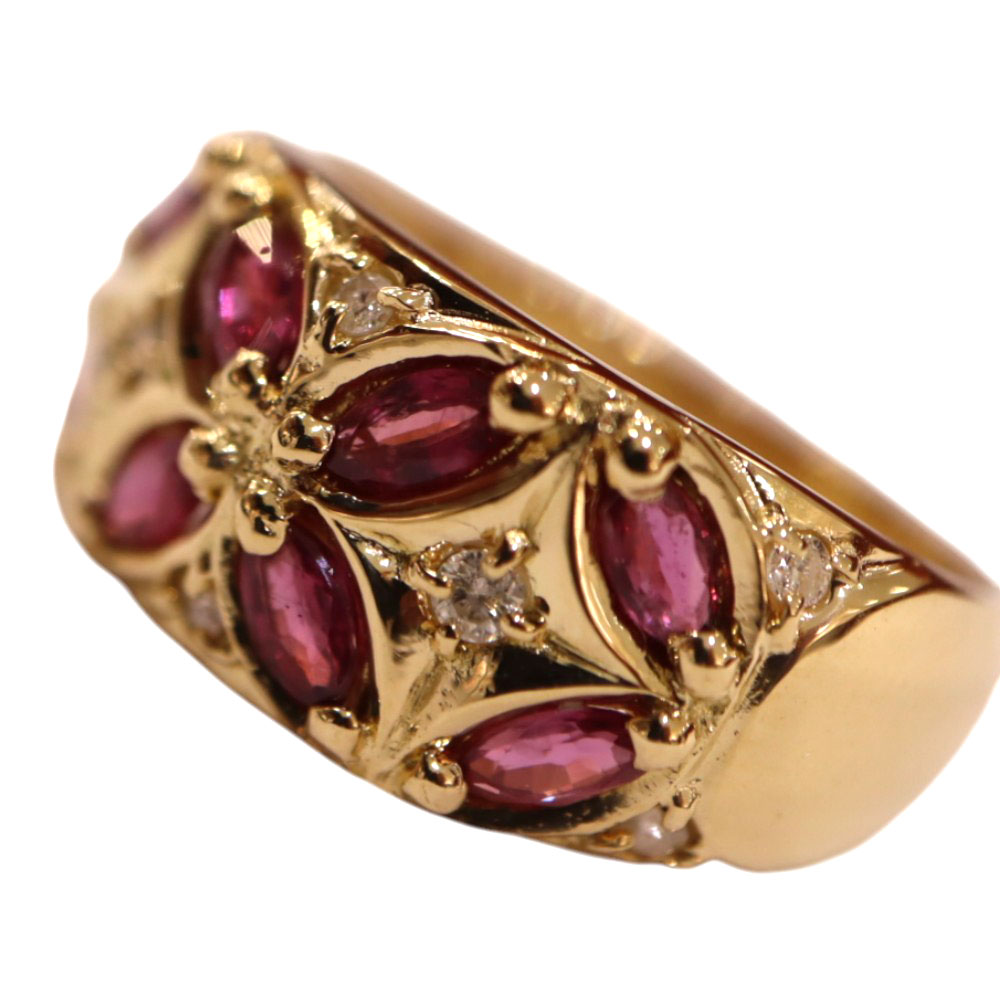 | 商品説明 | K18【18金】ルビー ダイヤモンド リングのご紹介です。 お花のようなデザインにセッティングされたルビーとダイヤモンドが手元を華やかに演出します。 お探しの方はこの機会に是非いかがでしょうか。