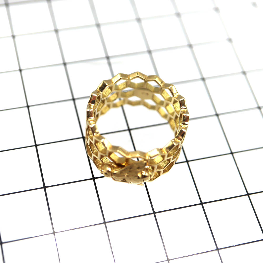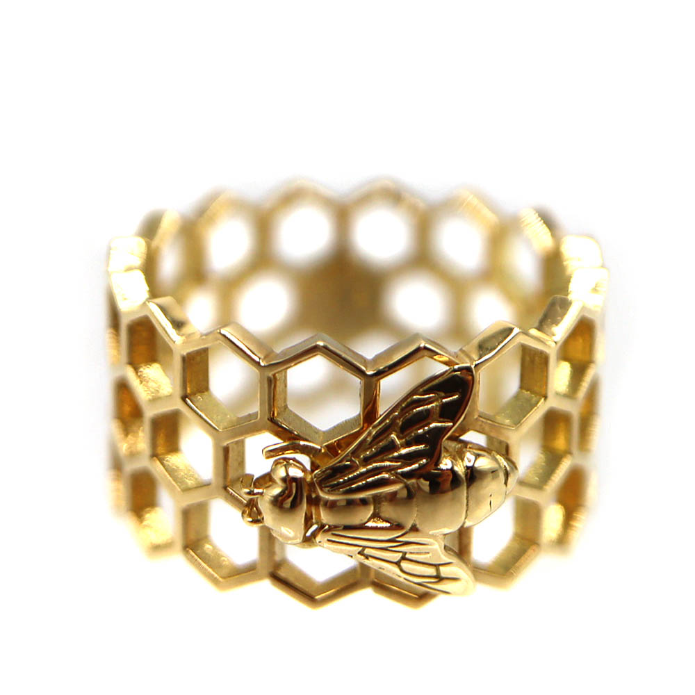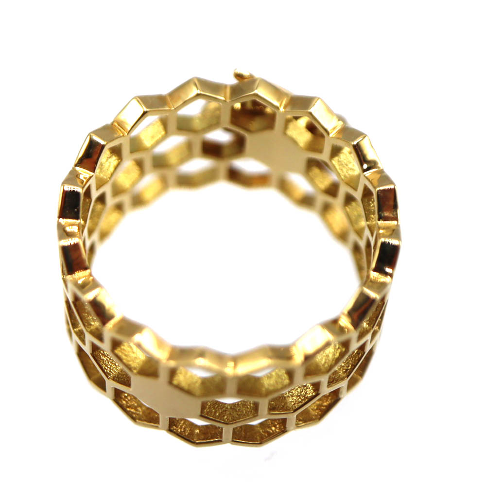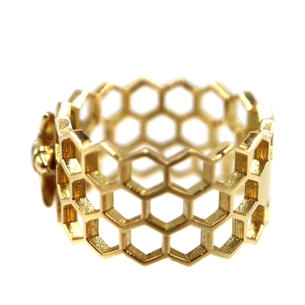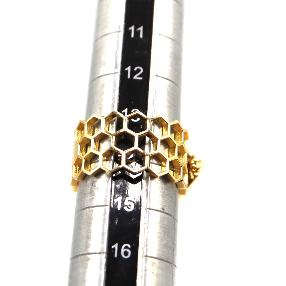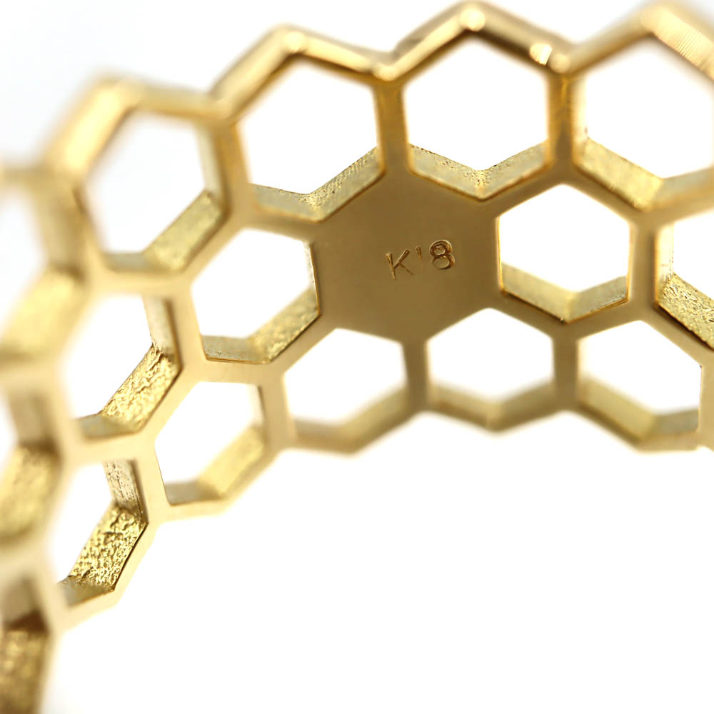 蜂の巣をイメージしたハニカム(六角形)デザインが特徴で、幾何学的で洗練された印象を与えるリング。