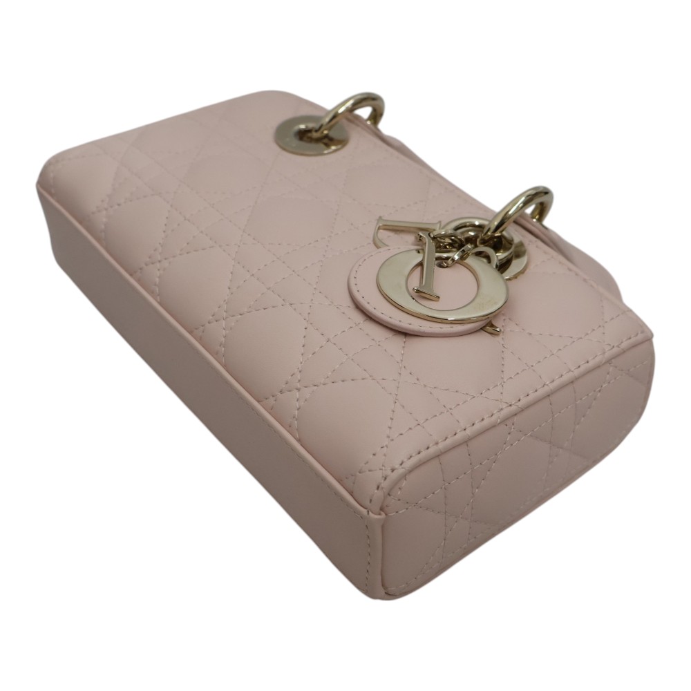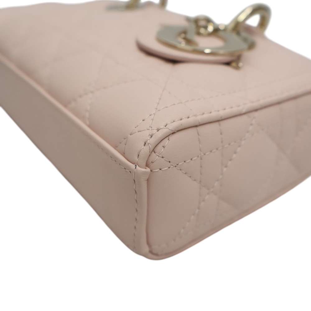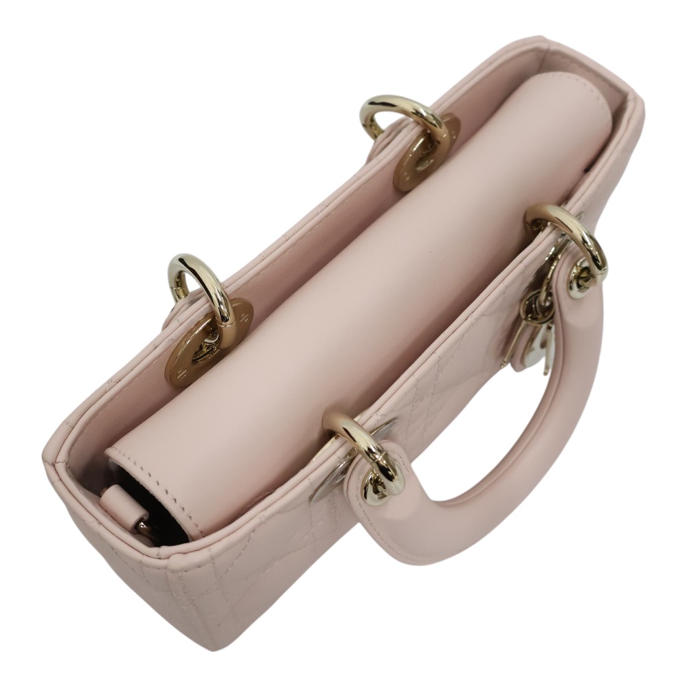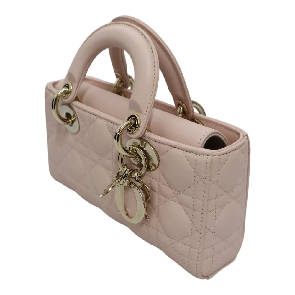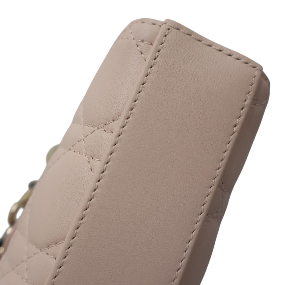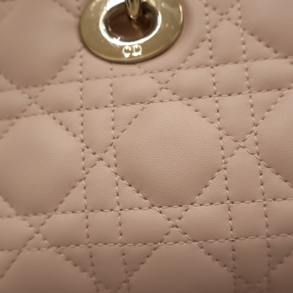 Diorの「Lady D-Joy」シリーズのスモールバッグは、 メゾンの象徴的なデザインを受け継いだエレガントなハンドバッグです。 上質なラムスキンにブランドを象徴する「カナージュ」ステッチを施し、 洗練されたタイムレスな印象に仕上げています。 ペールゴールドトーンのD.I.O.R.チャームが上品なアクセントとなり、 ラグジュアリーな雰囲気を演出。取り外し可能なチェーンストラップと レザーストラップが付属し、ハンドバッグ、ショルダー、クロスボディの 3WAYで使用できます。スマートフォンやカードケース、リップなどの必需品が 収納できる実用的なサイズで、デイリーからフォーマルまで幅広く活躍するアイテムです。