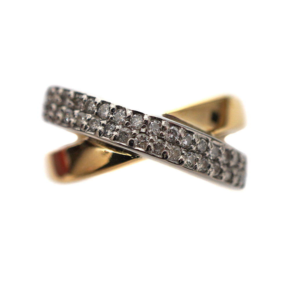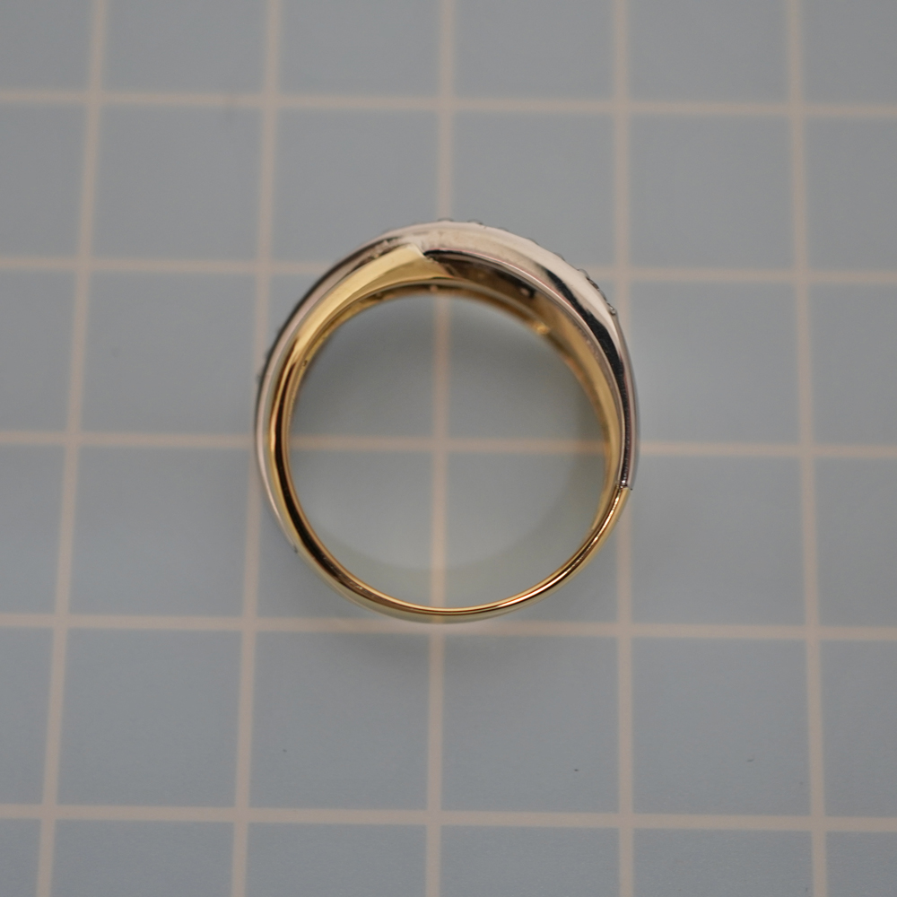 ゴールドとプラチナがクロスしたデザインで存在感のあるリングです。 お手元のアクセントにおすすめです。 是非いかがでしょうか。