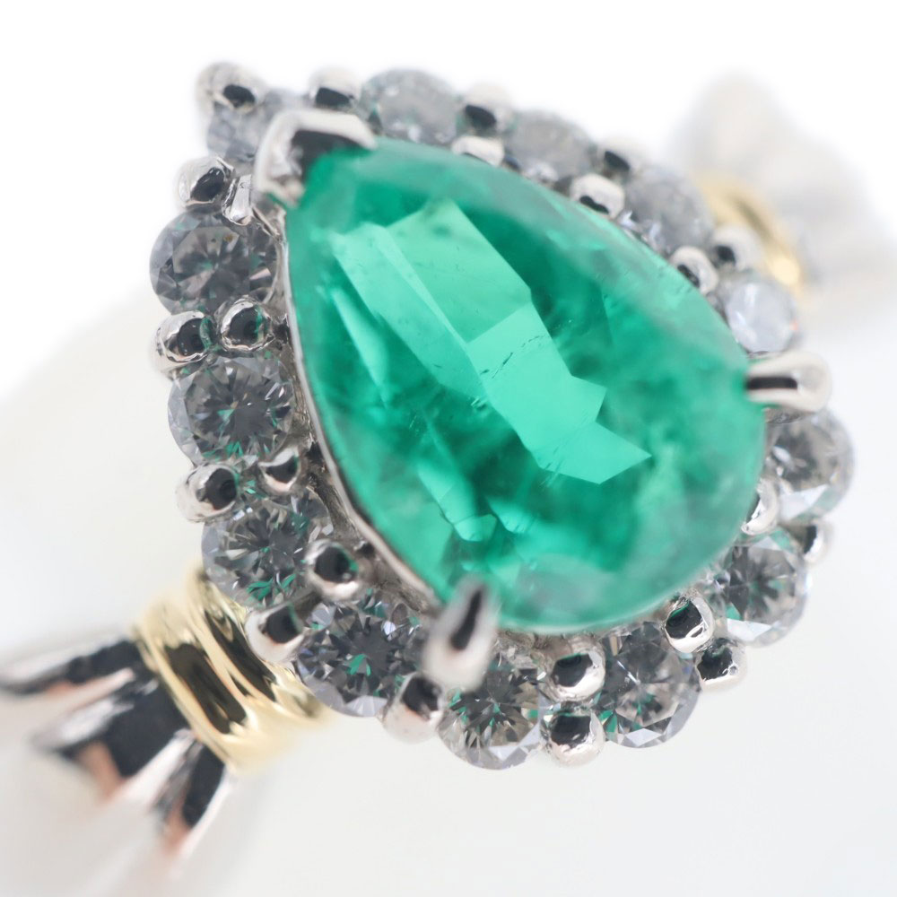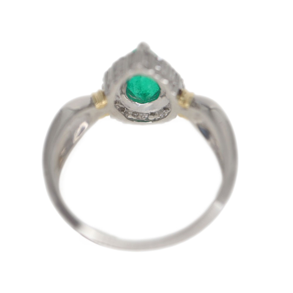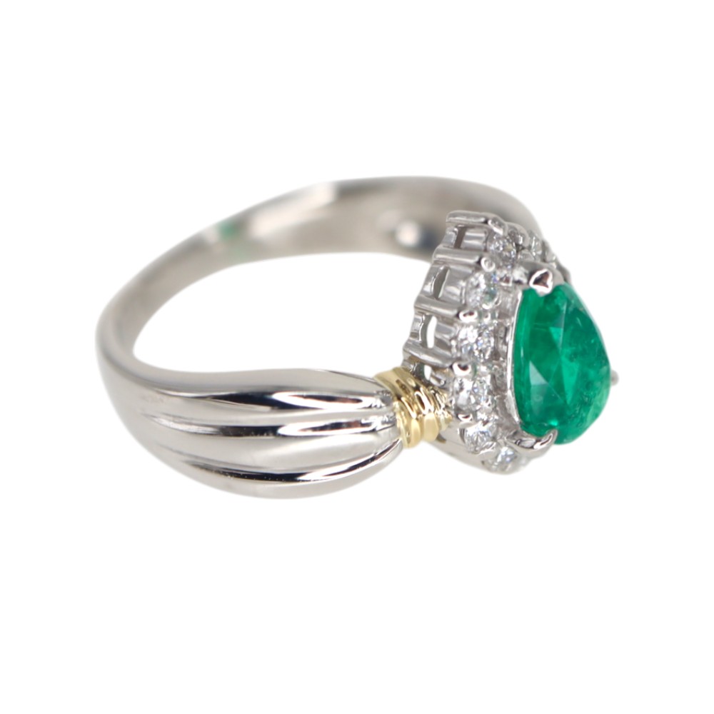 中央にはドロップモチーフのエメラルドがセッティングされています。 0.819ctもあるゴージャスな指輪です。 さり気なくゴールドもアクセントにデザインされているので、シンプルながらもデザイン性を感じます。
