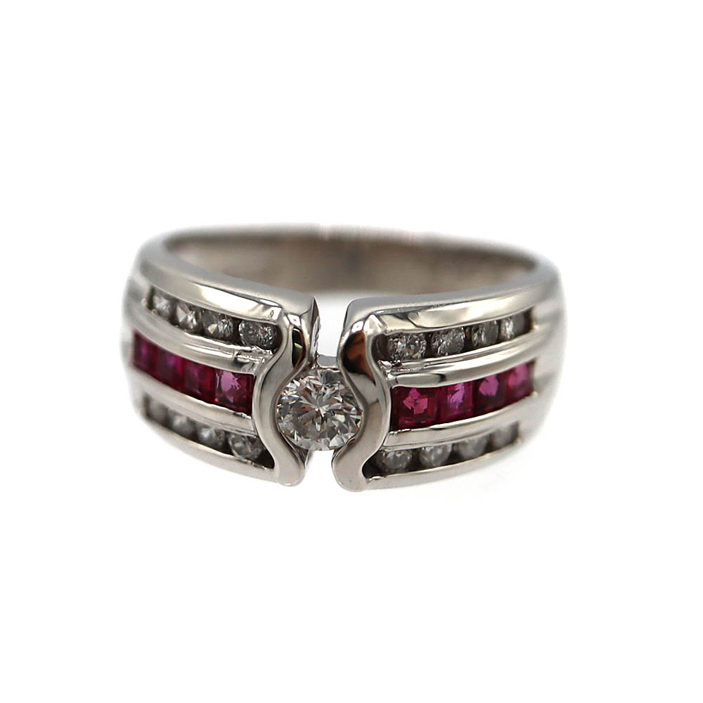 中央には美しく輝くダイヤモンドをセッティングし、その周囲をルビー(計0.47ct)とダイヤモンド(計0.50ct)が華やかに彩ることで、上品さと存在感を兼ね備えたデザインに仕上がっております。