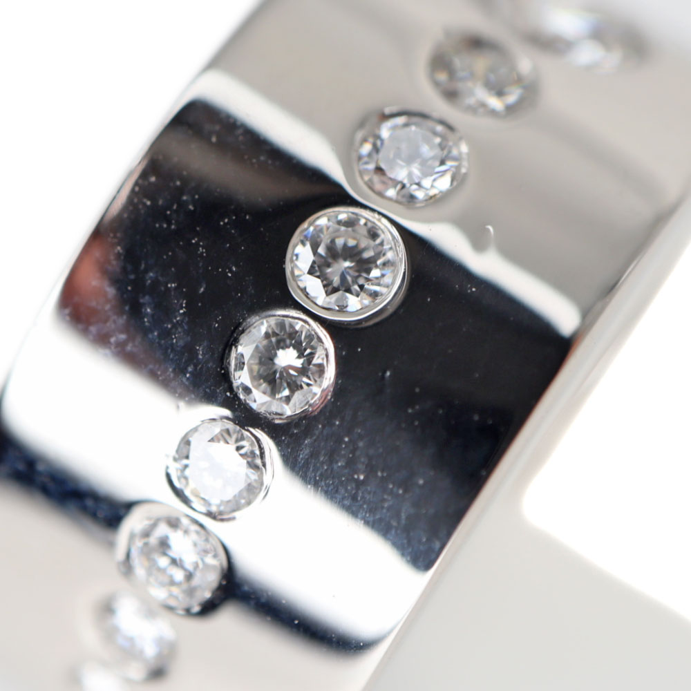 ダイヤモンドが側面に埋め込まれているのでシンプルながらもラグジュアリー感があります。 インパクトがある見た目なので、ワンポイントのアクセサリーにぴったりです。