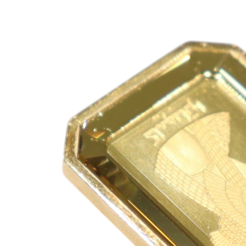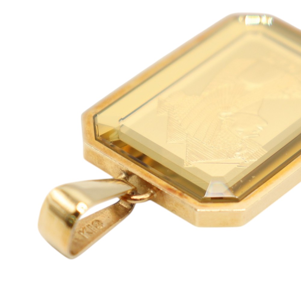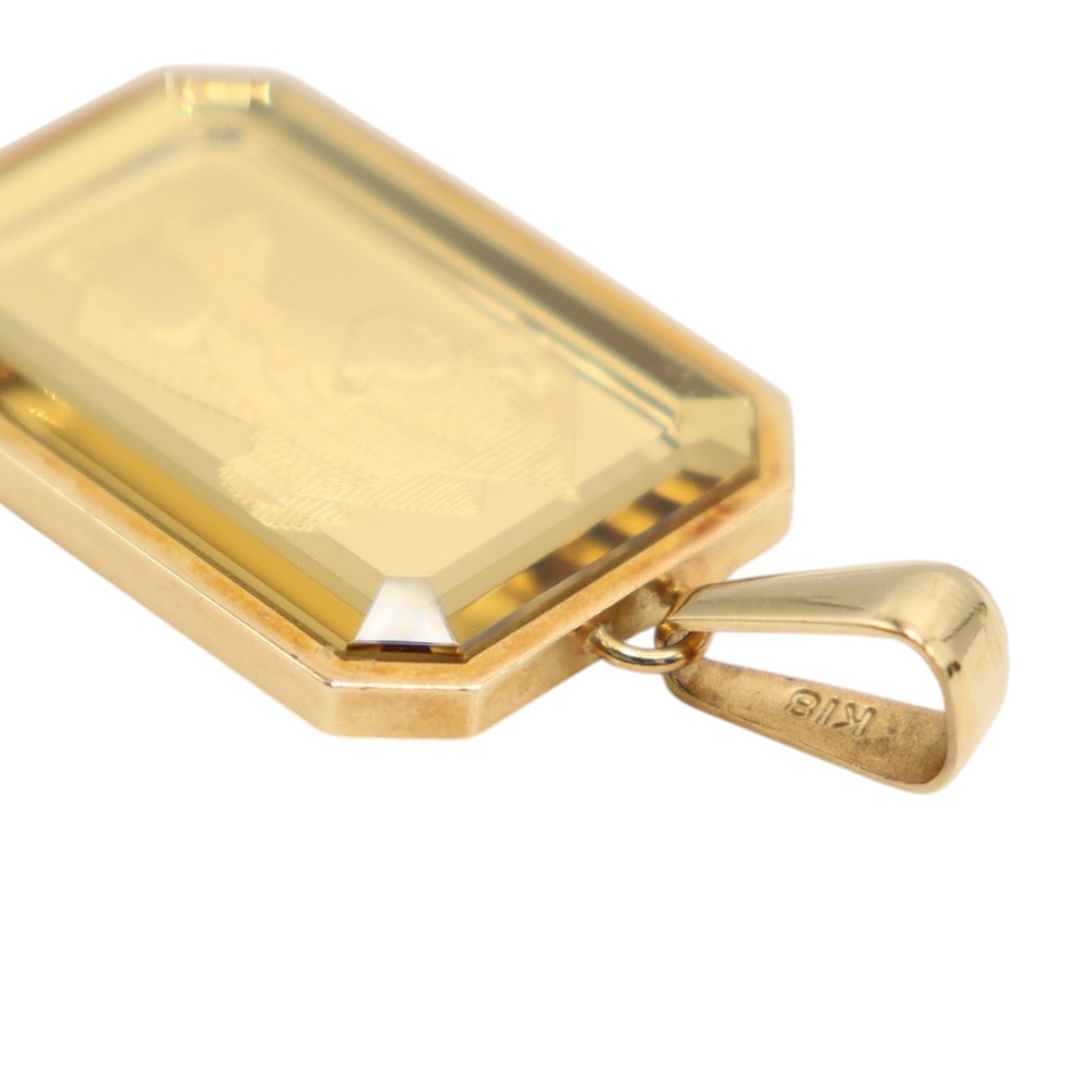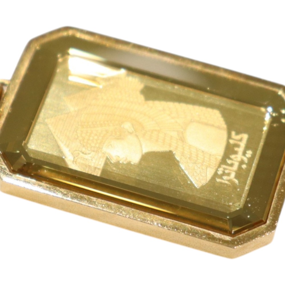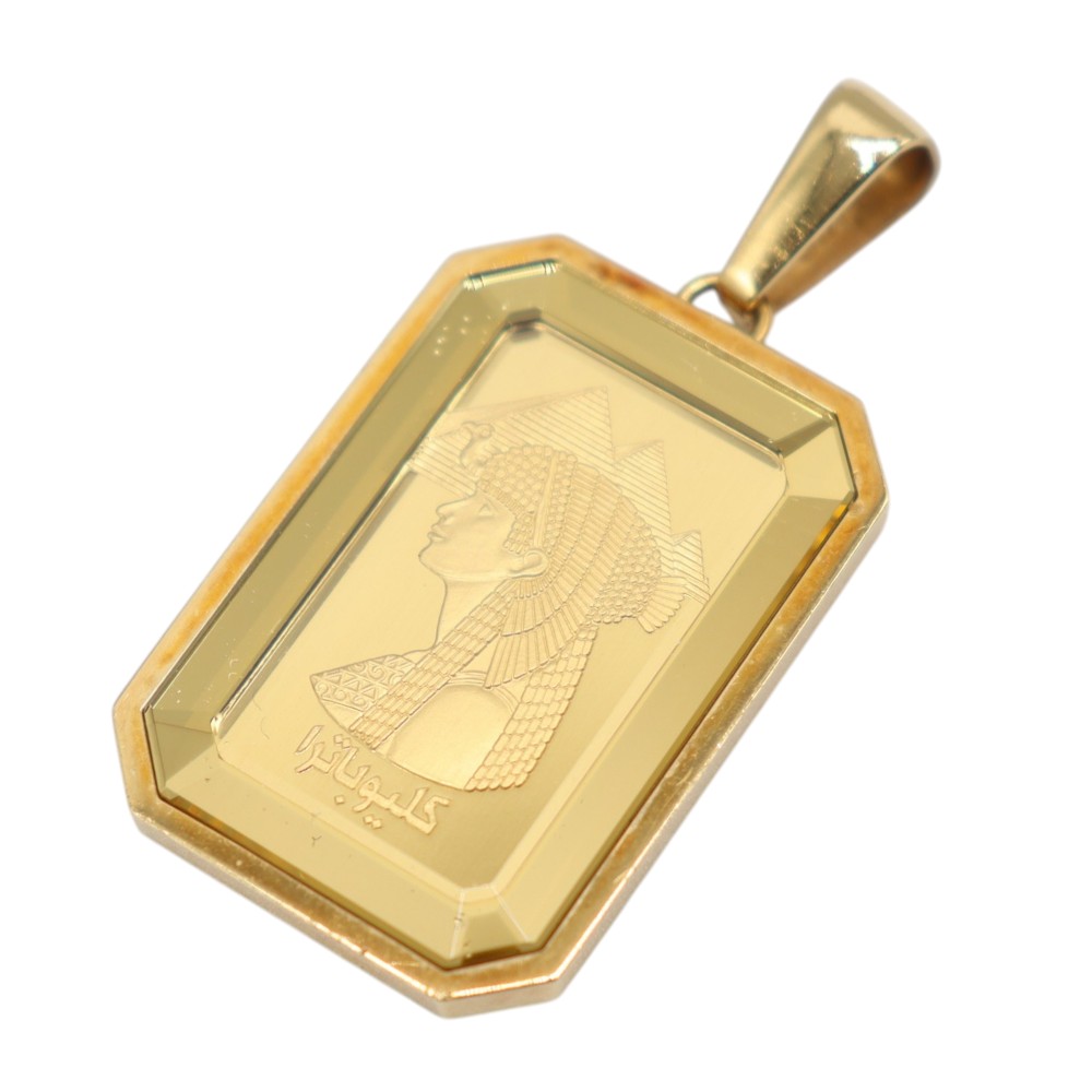 K18イエローゴールドの枠に、ミニバーが(5g)がセットされた高級感あふれるペンダントトップです。 クレオパトラの横顔が刻まれたミニバーはアクセサリーとしての美しさも引き立つお品物です。 存在感のあるミニバーは、資産価値の高さはもちろん、ファッションアイテムとしても人気。