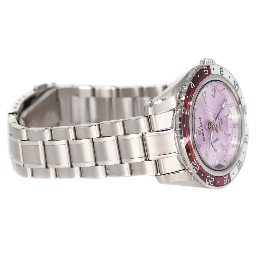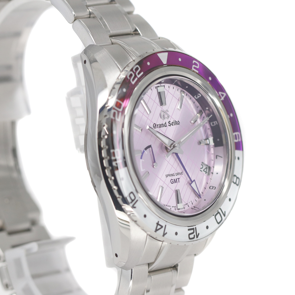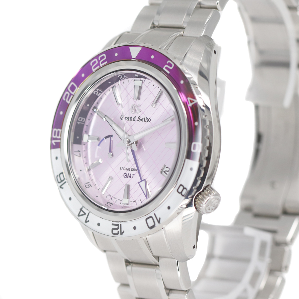 グランドセイコーのスプリングドライブが入荷しました。 銀座限定のモデルです。 伝統と品格の象徴カラー「紫」と「銀座」の情緒を融合したデザインとなっております。 グランドセイコーが誇る「スプリングドライブ」が搭載されており、GMT機能もあるため、回転ベゼルと合わせて3つのタイムゾーンを知ることが出来ます。