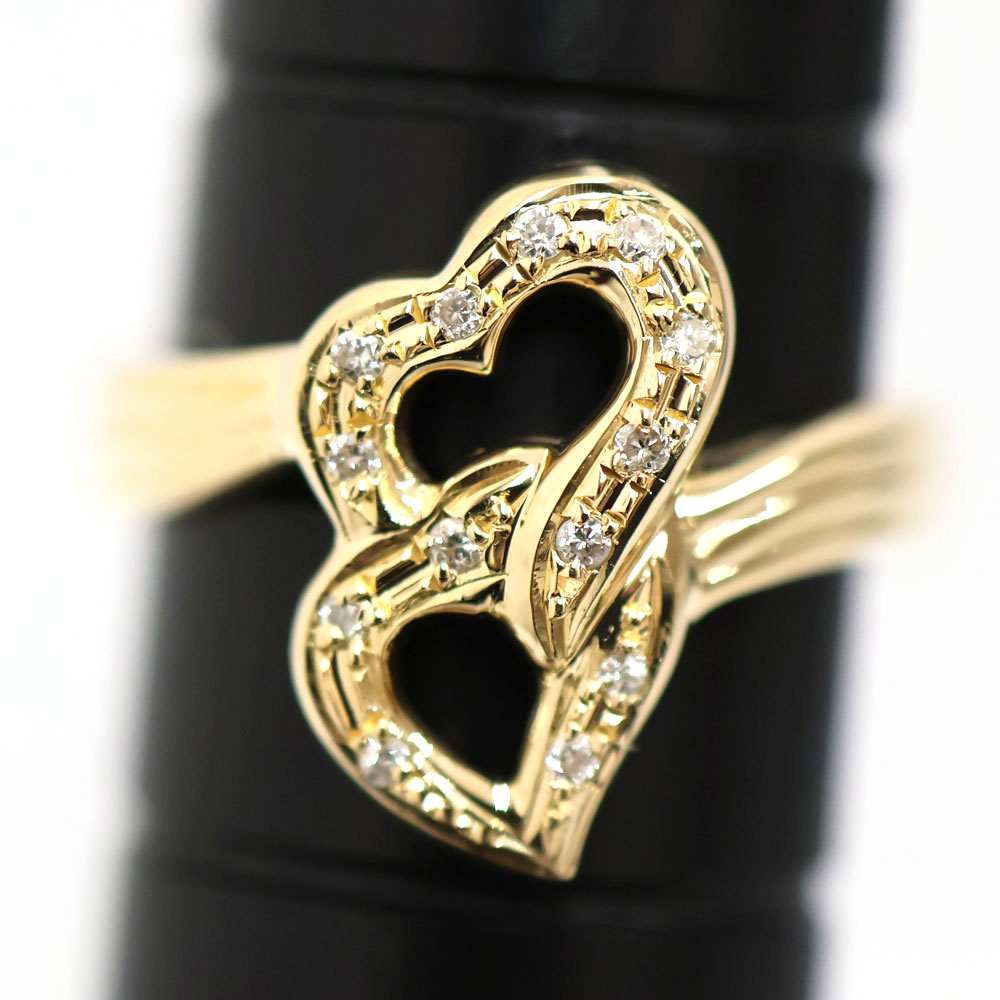 オープンハートを思わせる曲線的なモチーフが重なり合い、女性らしい柔らかさと立体感を演出してくれます。 ハート部分には小粒のダイヤモンドがセッティングされており、繊細なきらめきを放ちます。 この機会に是非いかがでしょうか。