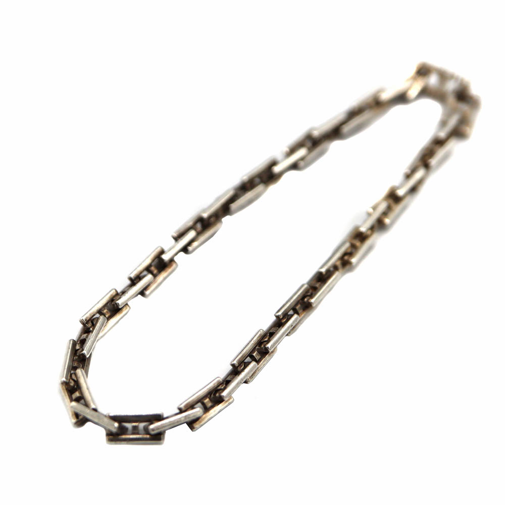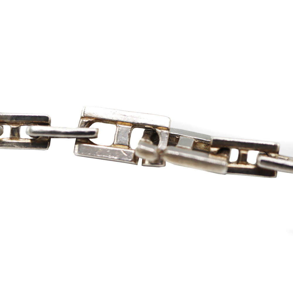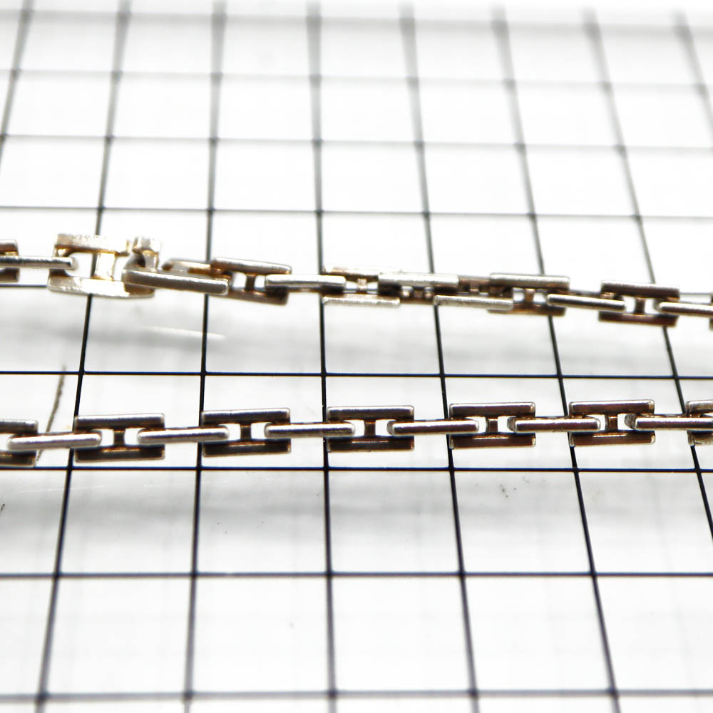 Hの形の金具が連なったシンプルでおしゃれなブレスレットです。 ファッションのポイントにぜひいかがでしょうか。 ■1マス、1cm×1cmの台の上で撮影しております。 ■傷、くすみ、変色がございますがまだまだお使いいただけるお品です。 |