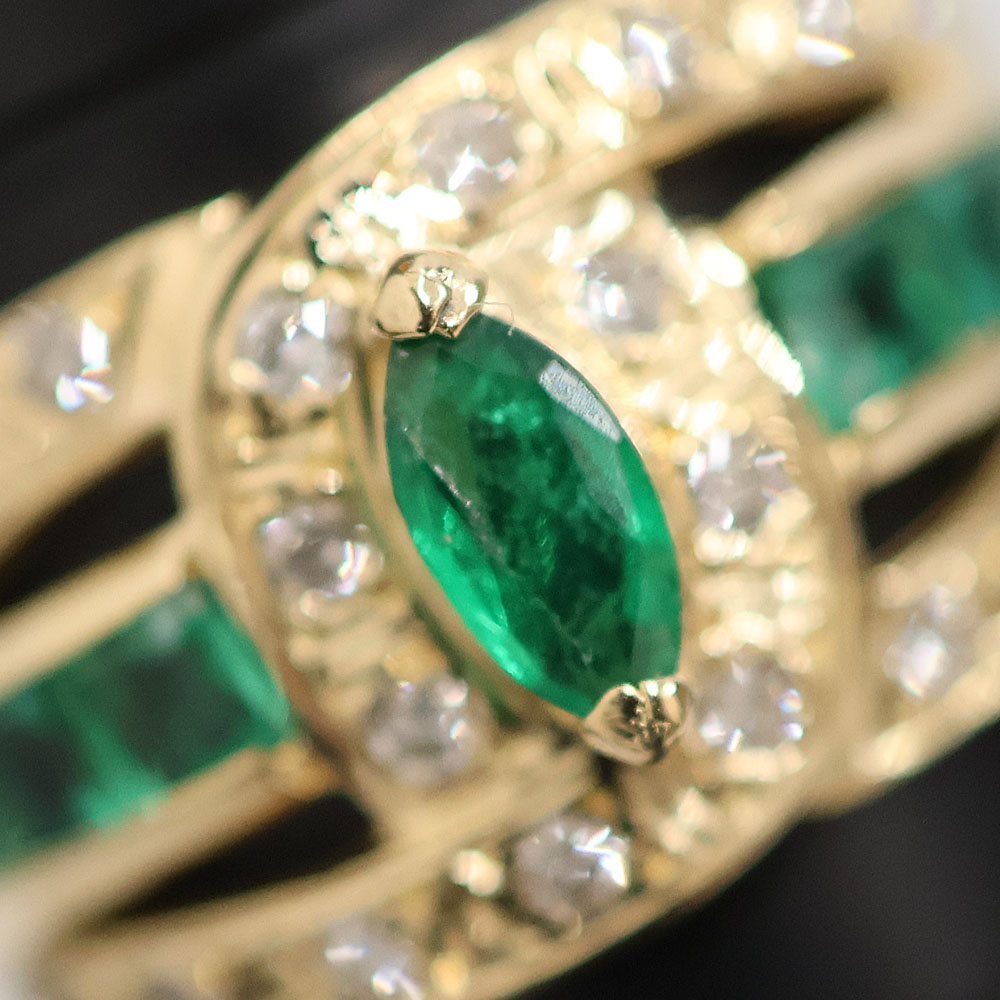 リング幅が最大1cmある豪華な指輪です。 バケットカットのエメラルドもセッティングされ、 豪華さがアップしこちらひとつでにお手元を華やかにしてくれます。 この機会に是非いかがでしょうか。