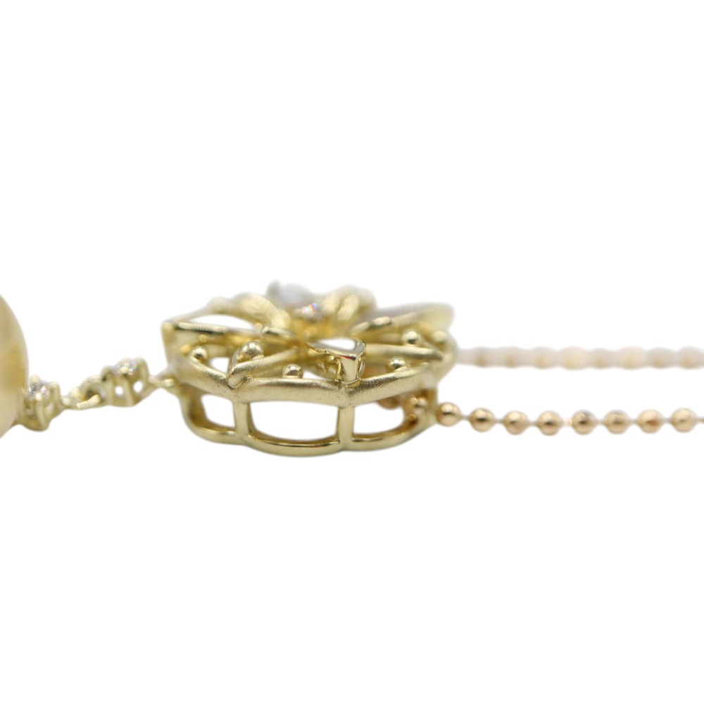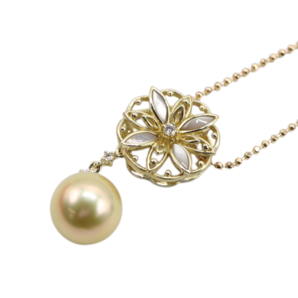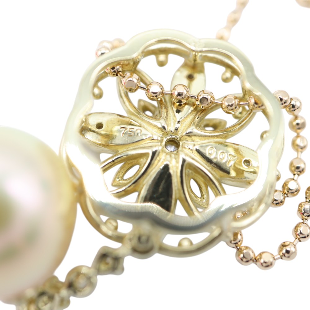パールと花のようなモチーフがダイヤでつながれたゴージャスなデザインのネックレスです。 特別な日の装いにプラスすると、コーディネートが格段に上がる一品です。