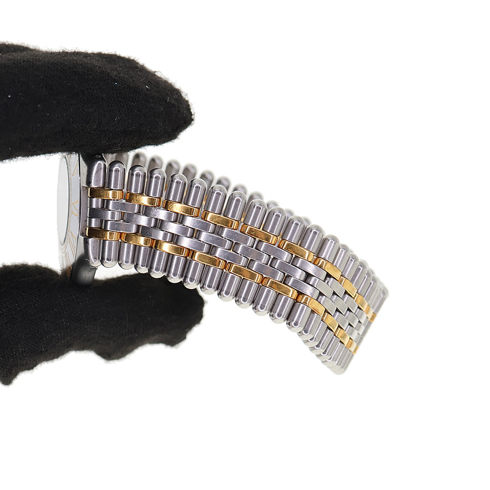 ローマ数字が刻まれたベゼルが特徴。 ステンレスとゴールドのコンビが目を惹くモデルです。 2針のシンプルで上品なつくりで飽きがきません。 この機会に是非いかがでしょうか。
